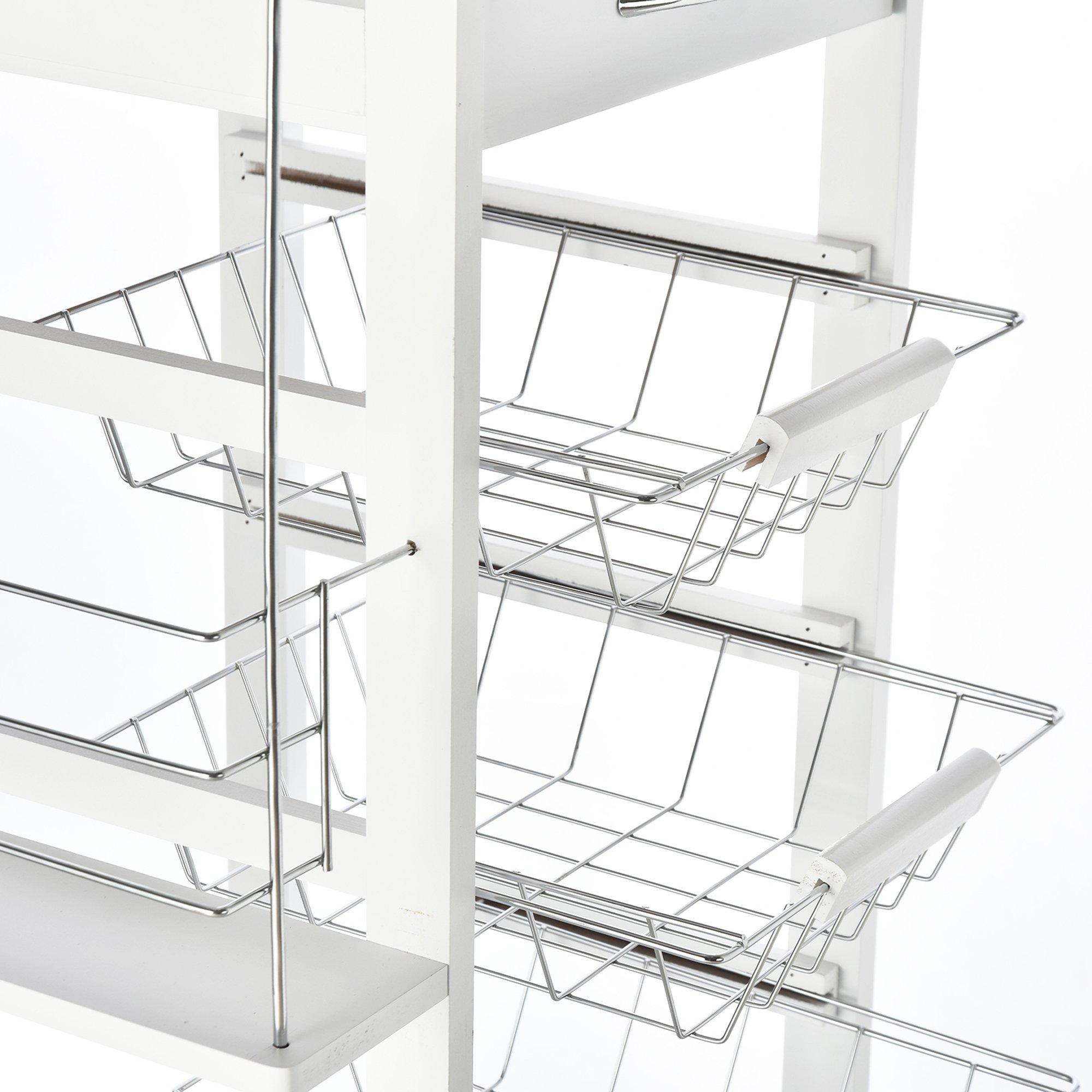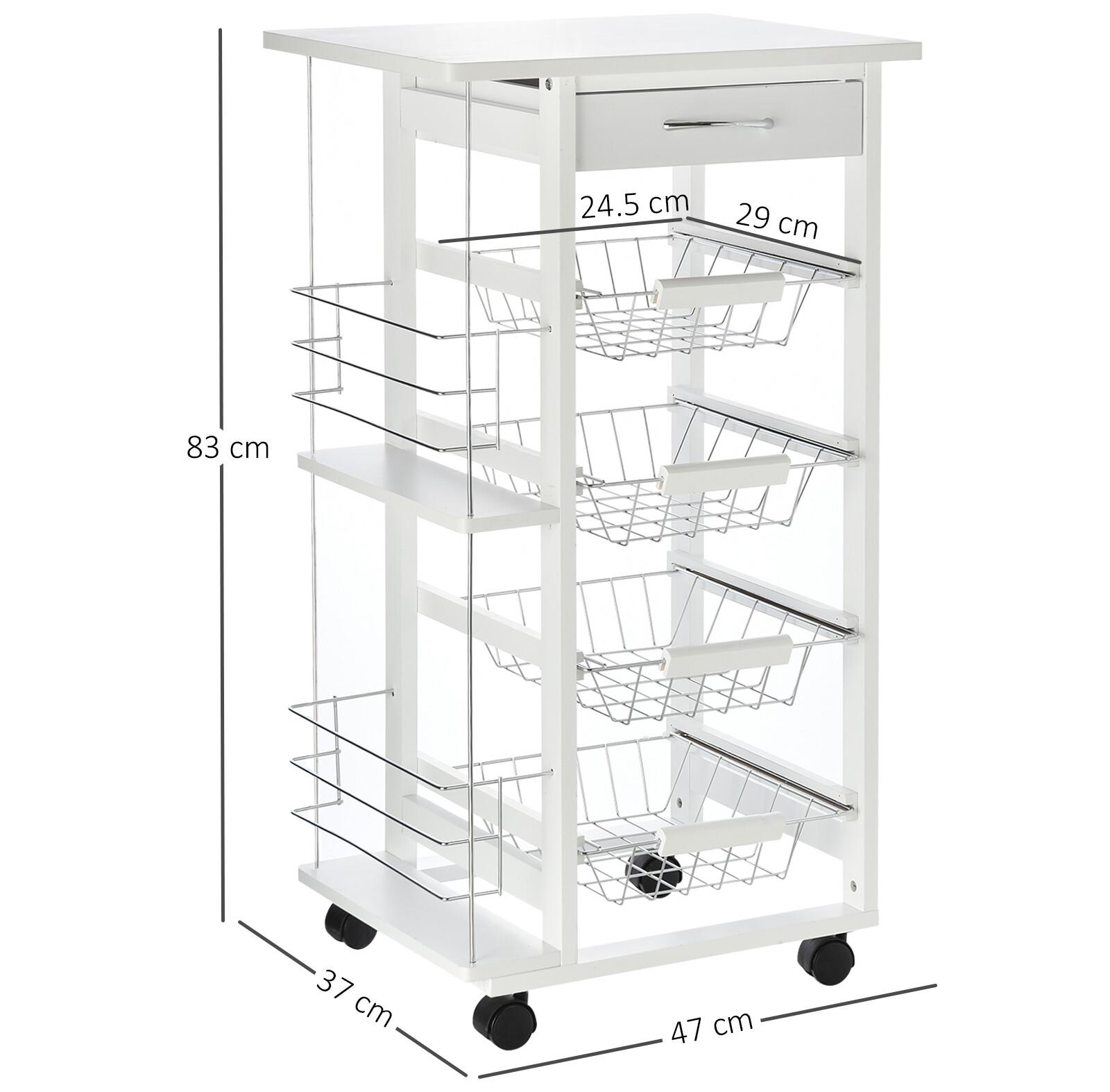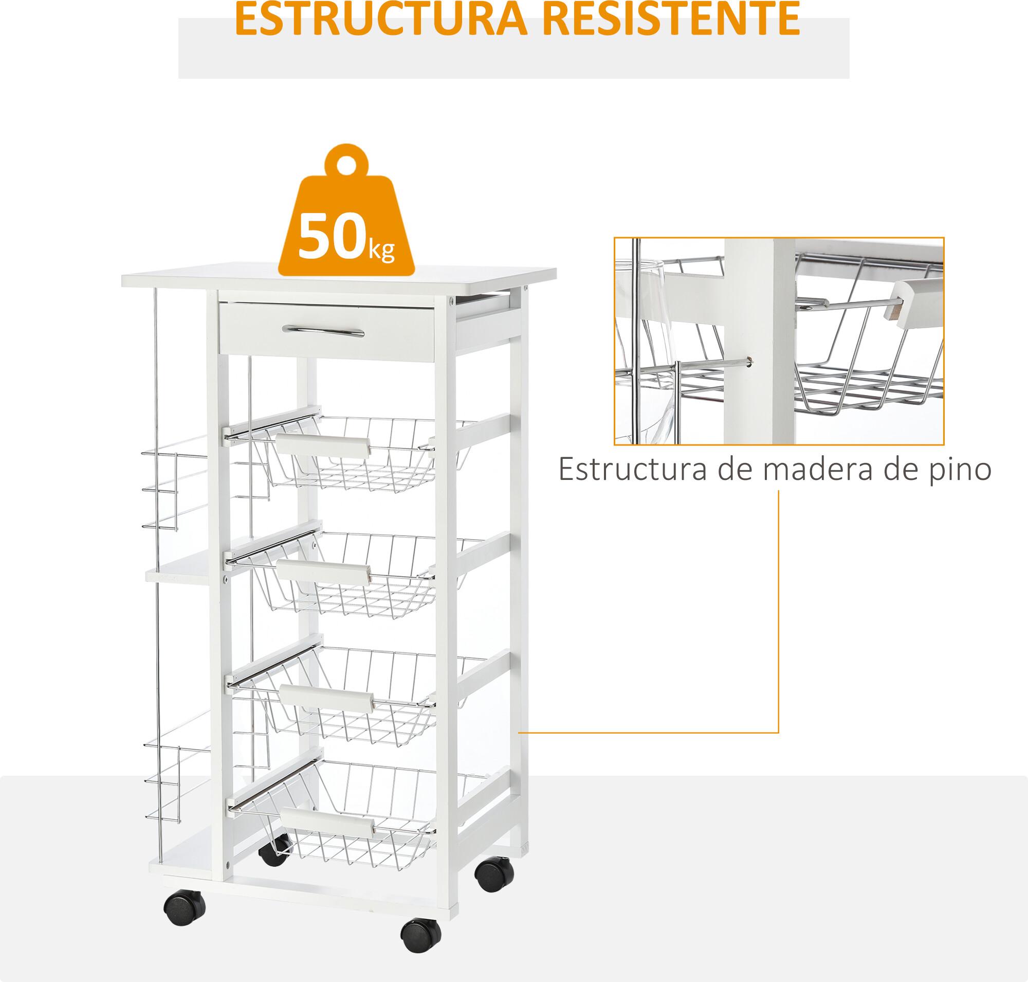 Este carrito auxiliar para cocina compacto de HOMCOM mantendrá tu cocina limpia y ordenada. Fabricado con tablero de MDF y madera de pino para ofrecerte la versatilidad que necesitas en tu día a día. Dispone de mucho espacio de almacenaje gracias a su combinación de cajón, bastidores laterales y cestas extraíbles. Además en la superficie de este fantástico carrito auxiliar para cocina compacto podrás preparar tus alimentos o utilizarlo para dejar de forma ordenada platos, pequeños electrodomésticos o lo que necesites. Por sus 4 ruedas te será súper fácil moverlo de un lado a otro. ¡Consigue más funcionalidad en tu casa con este carrito auxiliar de cocina con ruedas de HOMCOM!