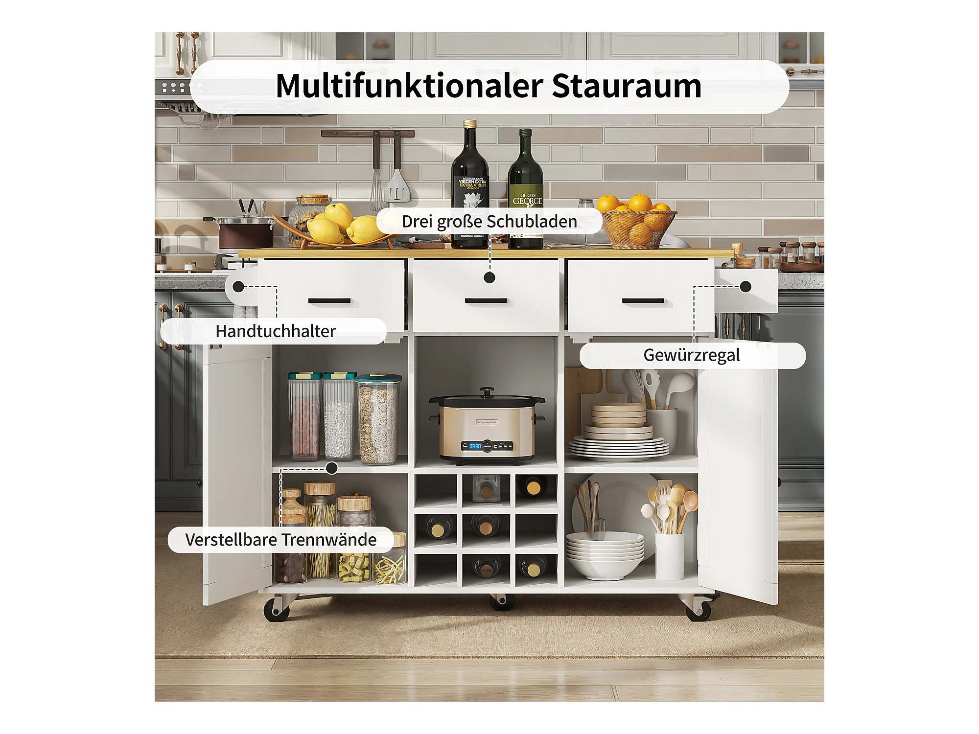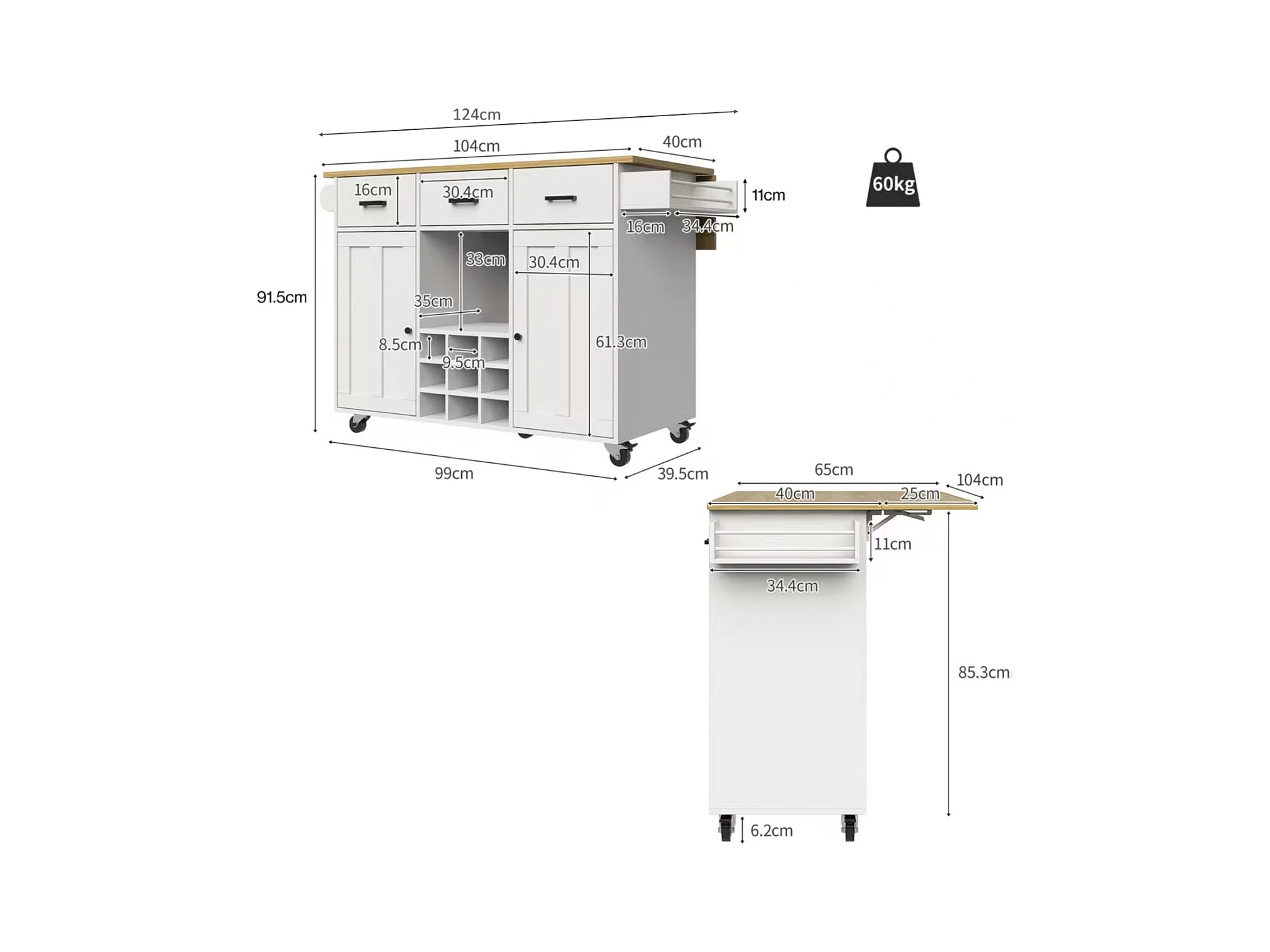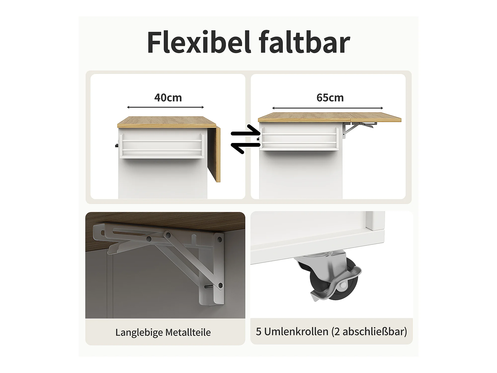 Carrito de cocina multifunción, tapa abatible, 2 cajones, ruedas, blanco y natural (L120 x P40 x H89 cm)