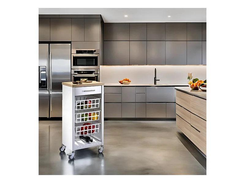Carrito de cocina con encimera, 4 cestas metálicas, carro de oficina móvil, madera de arce, (49,5x31x91 cm)