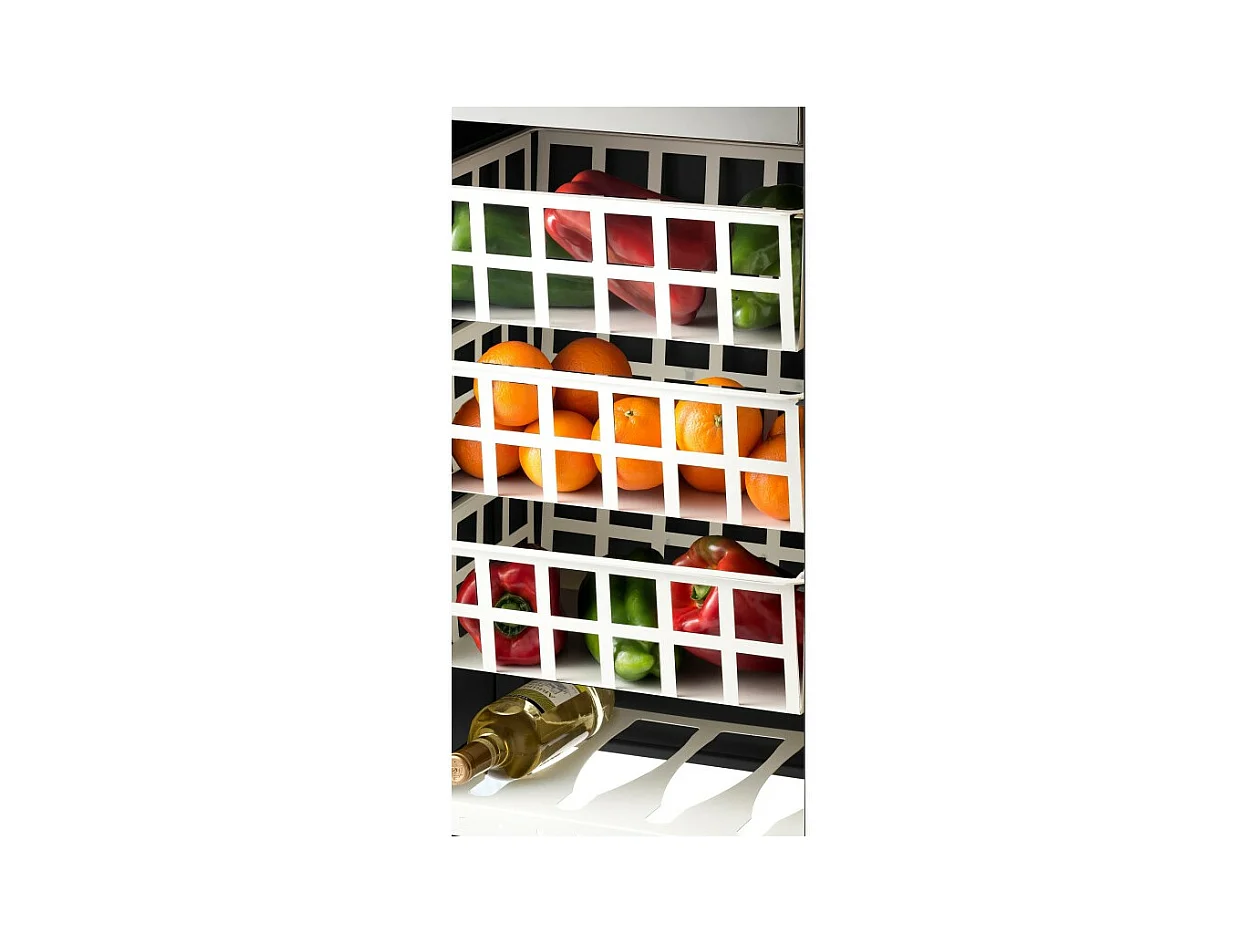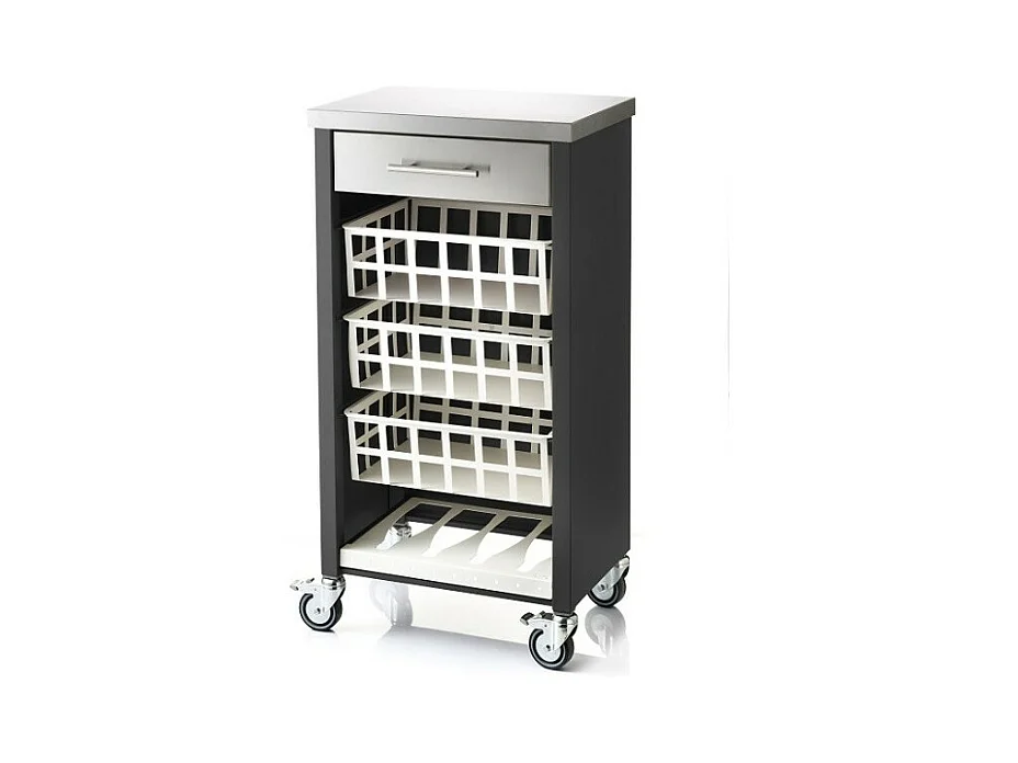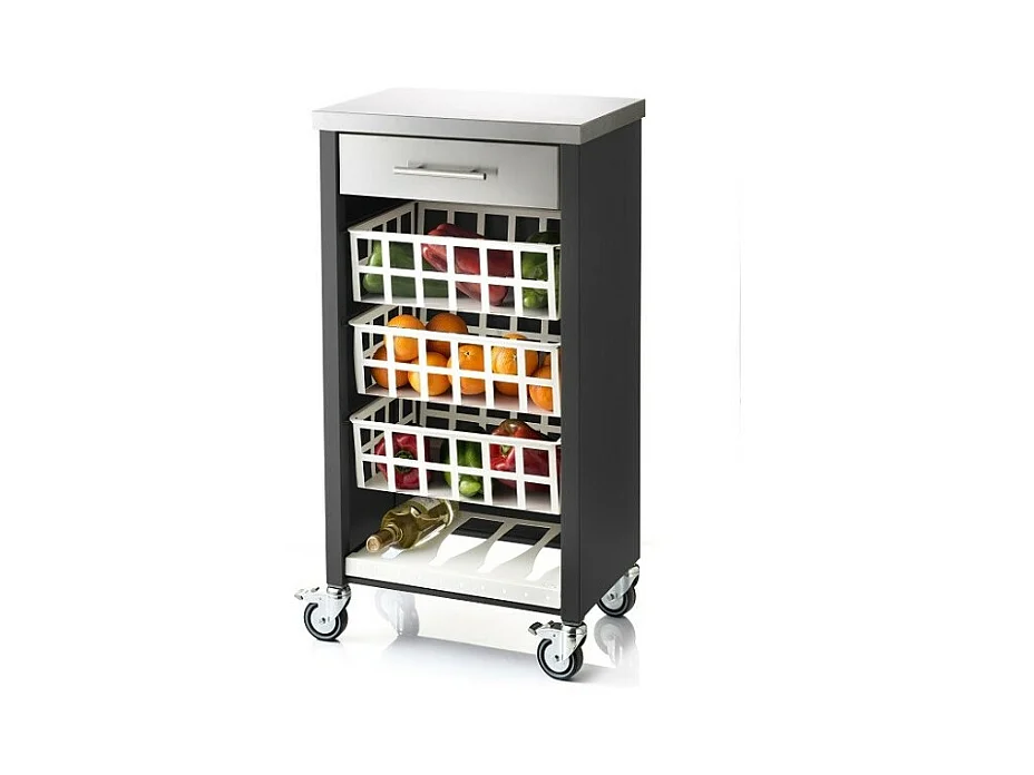 Carrito auxiliar FIFTY-FIFTY con 3 cestas metálicas, encimera de acero inoxidable y ruedas. Diseño moderno y funcionalidad