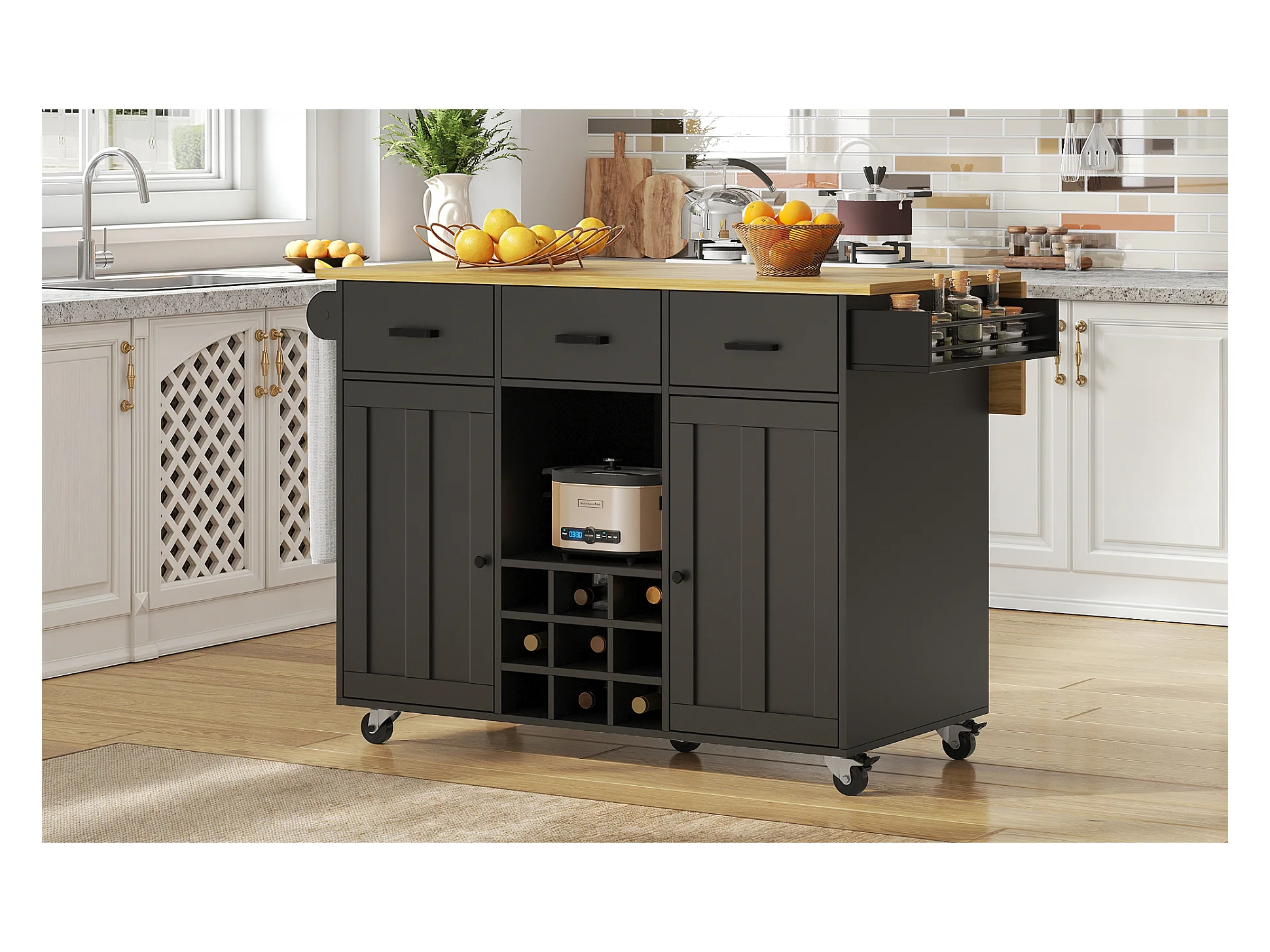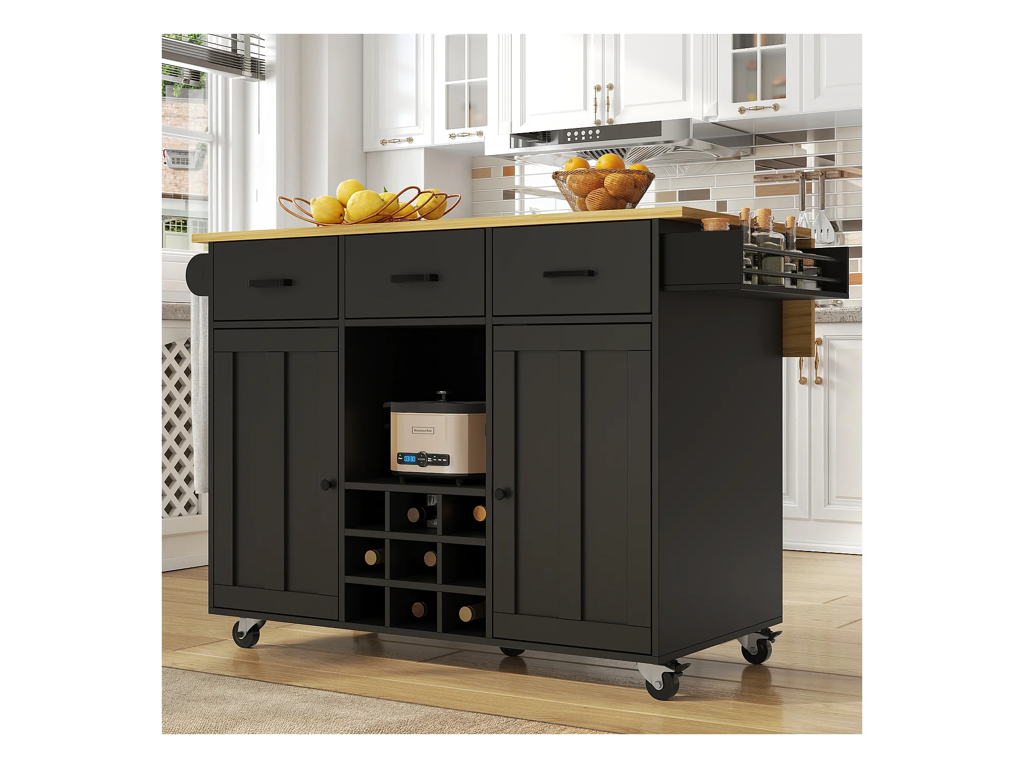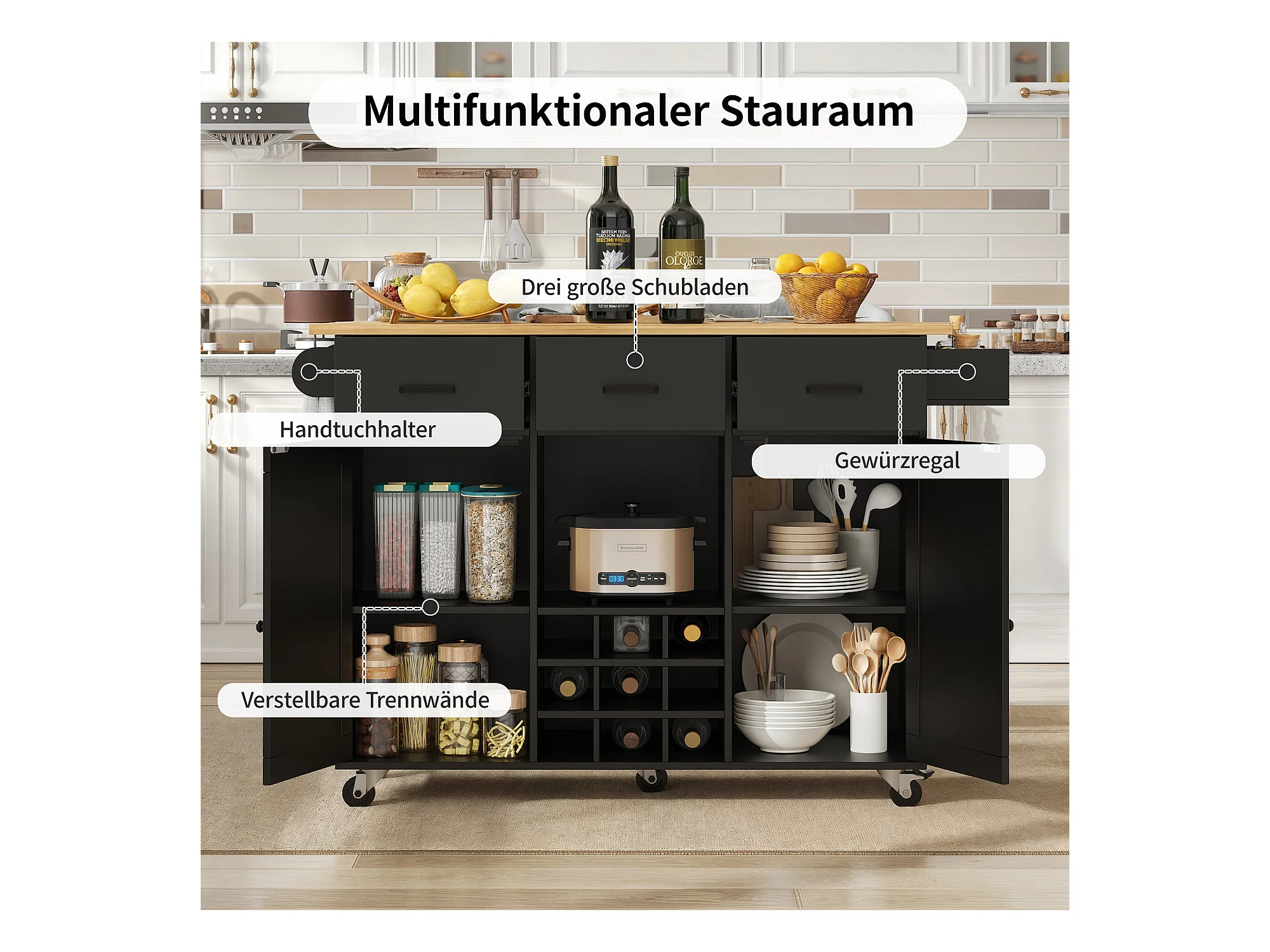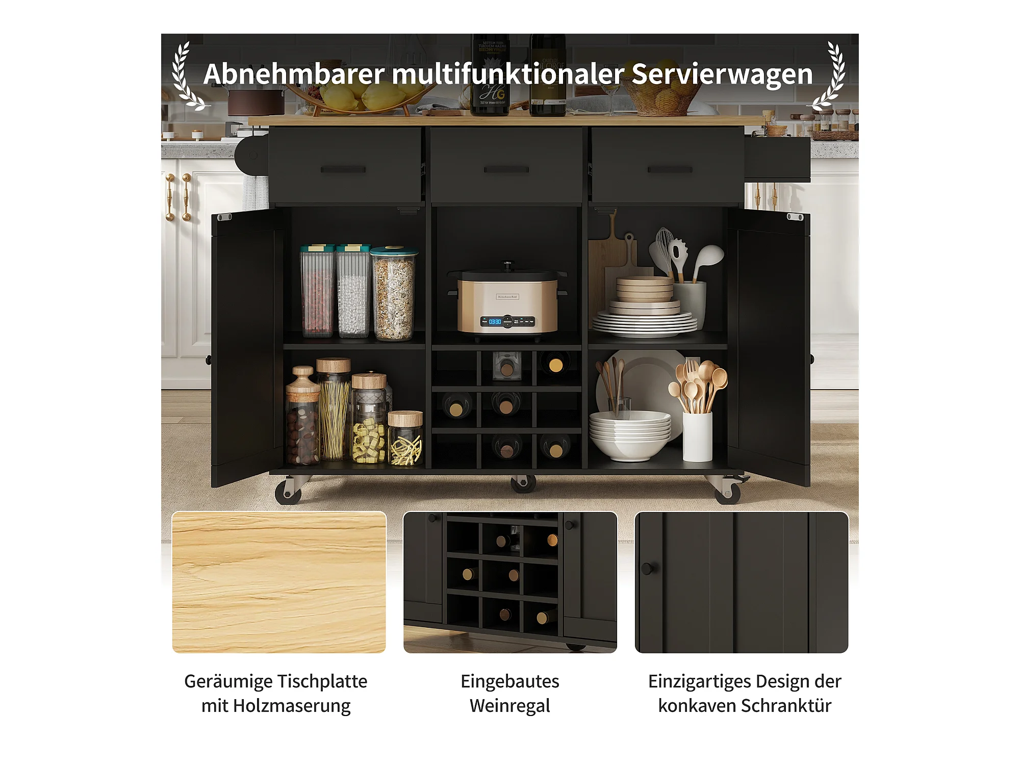 Carrito de cocina móvil negro moderno y sencillo con estantes y cajones, encimera de madera clara (129 x 46 x 92 cm)