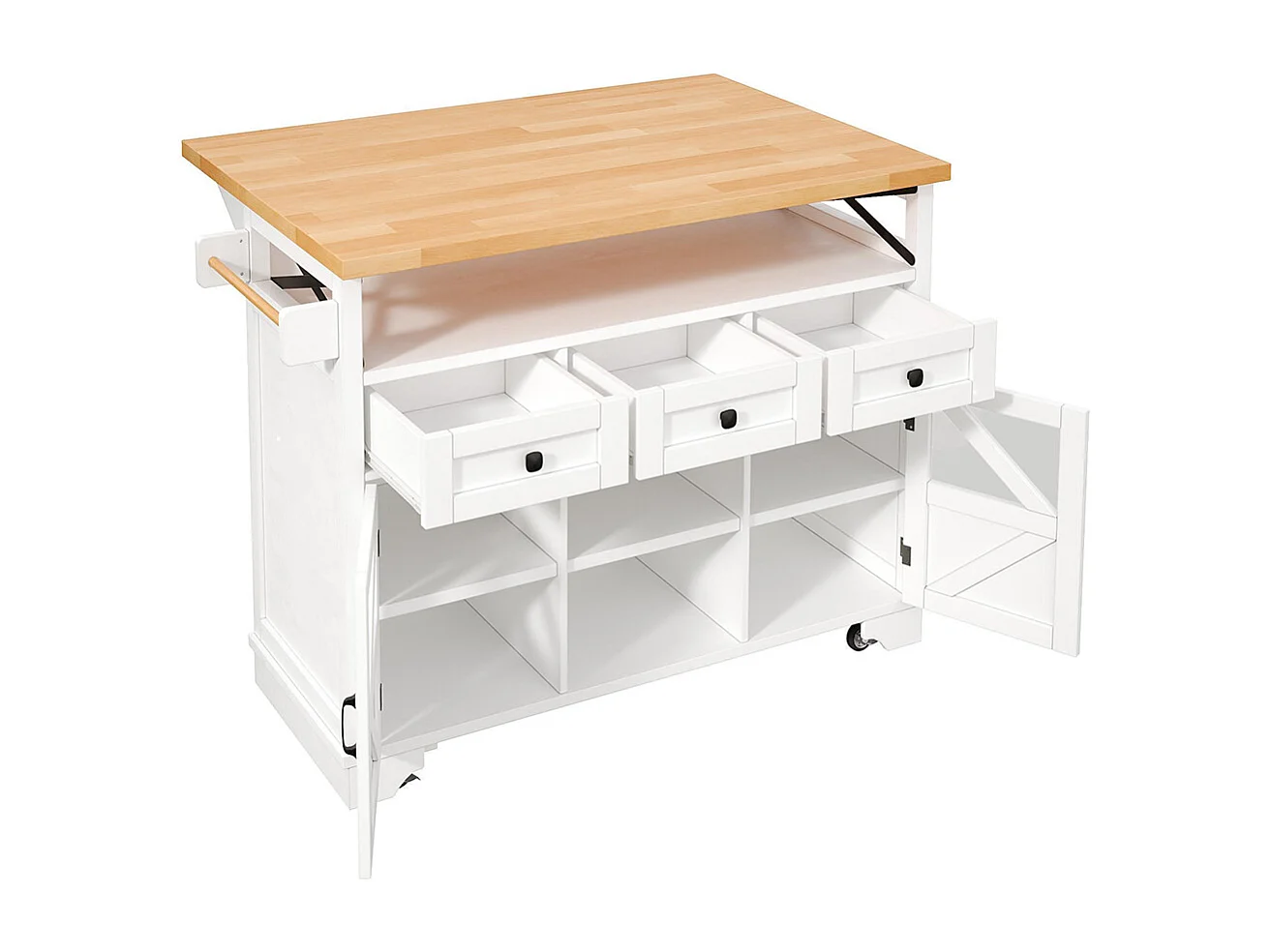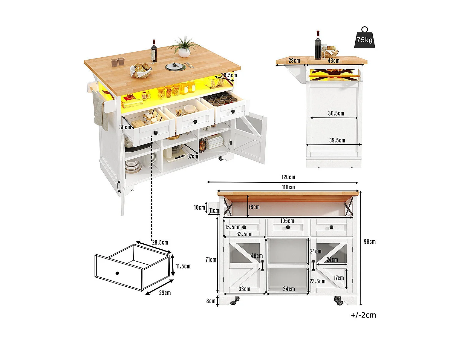 Carro de cocina multifuncional con aplicación LED y mesa plegable, móvil con tres cajones y dos puertas de armario, blanco