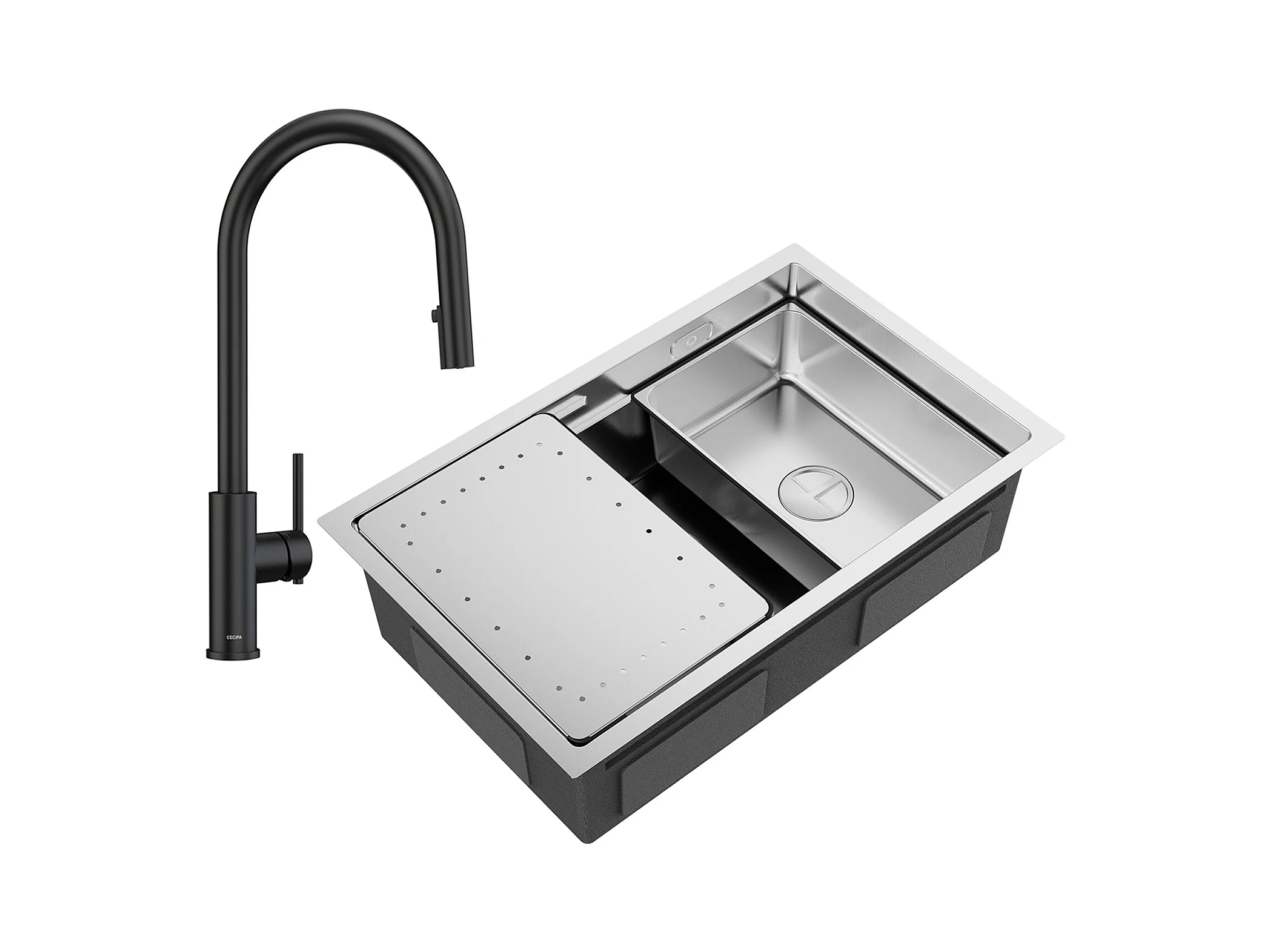 CECIPA MAX Fregadero 1 Seno 70×44cm Fregadero Cepillado con Escurridor y Lavabo + Grifo de Cocina Monomando con Ducha Extraíble, 2 Modos de Salida de Agua, Negro