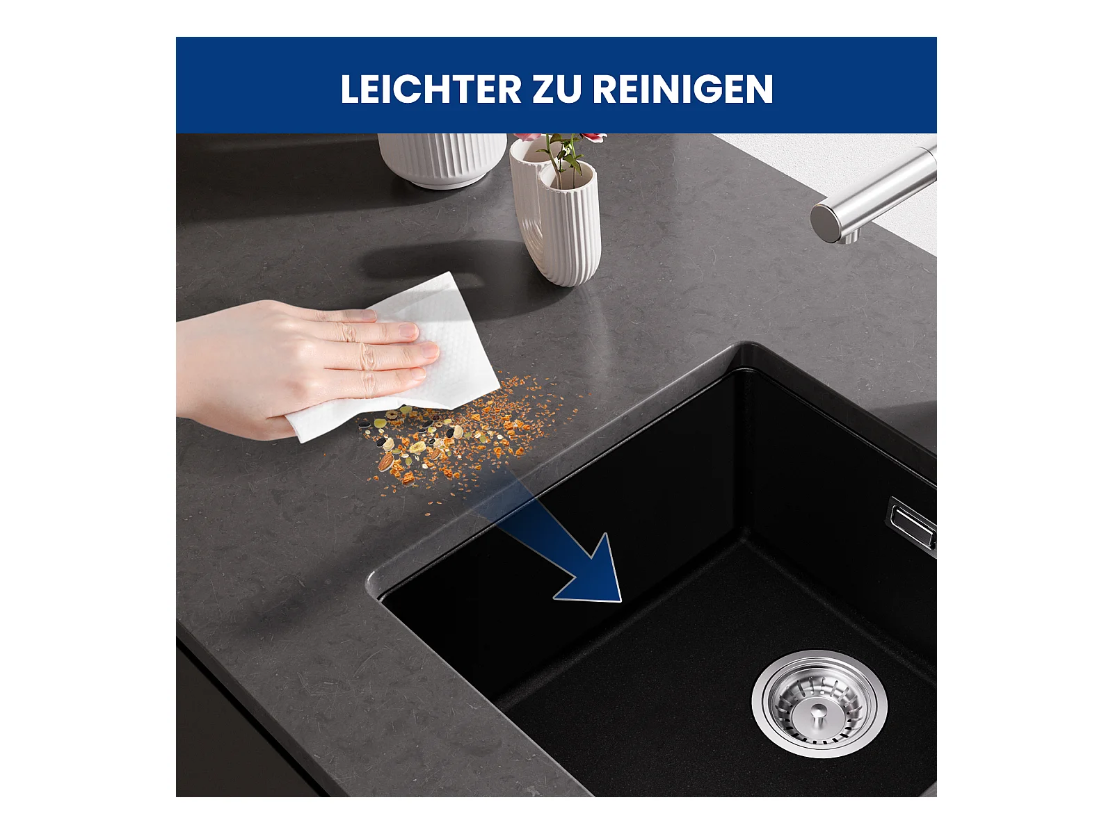 Fregadero de 1 seno en Cuarzo y Resina, 3 Opciones de Montaje, 45*44*20cm + Grifo de Cocina Monomando de Acero Inoxidable Negro
