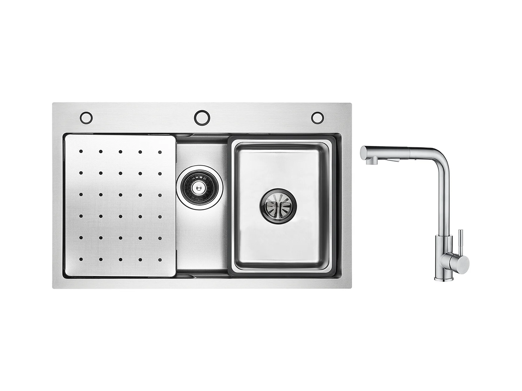 Fregadero de 1 lavabo 70×45×21,5CM Fregadero de acero inoxidable plateado con escurridor, lavabo, dispensador de jabón + grifo monomando con ducha extraíble, negro