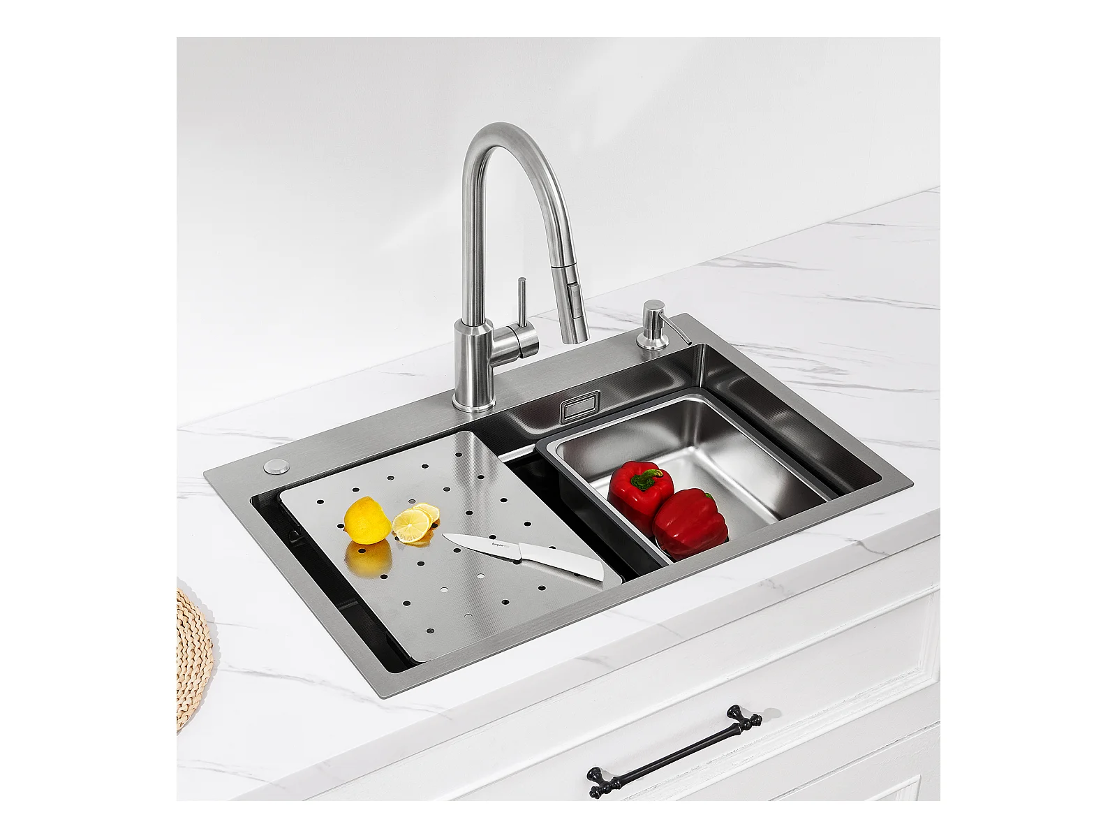 Cecipa max Fregadero de Acero Inoxidable 70×45×21,5CM con Escurridor, Lavabo y Dispensador de Jabón + Mezclador de Cocina con Ducha Extraíble Negro