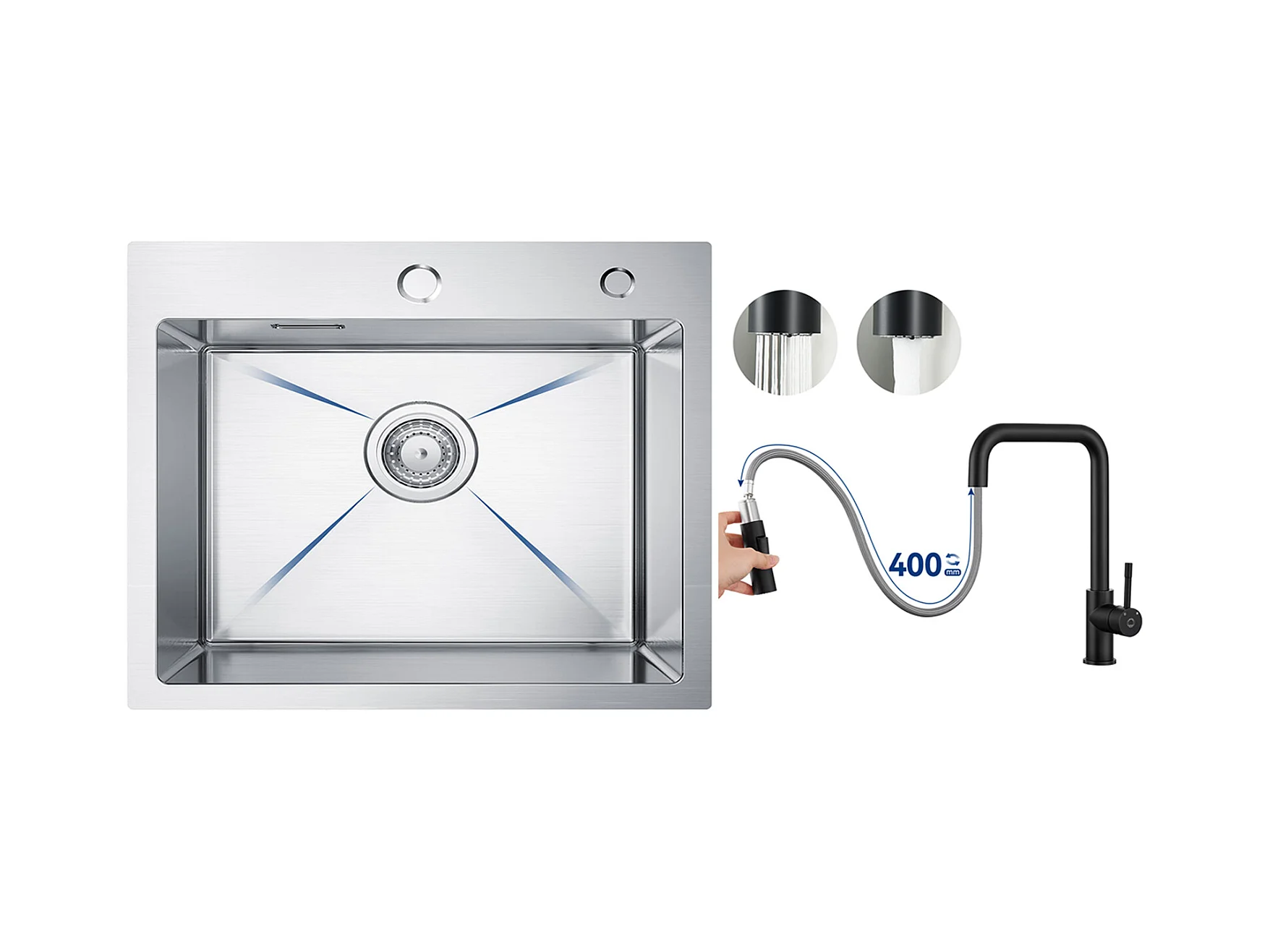 CECIPA MAX Fregadero de Cocina 1 Seno 50×45×18,5 CM Fregadero de Acero Inoxidable Cepillado + Mezclador de Fregadero de 3 Vías, 2 Palancas, Negro