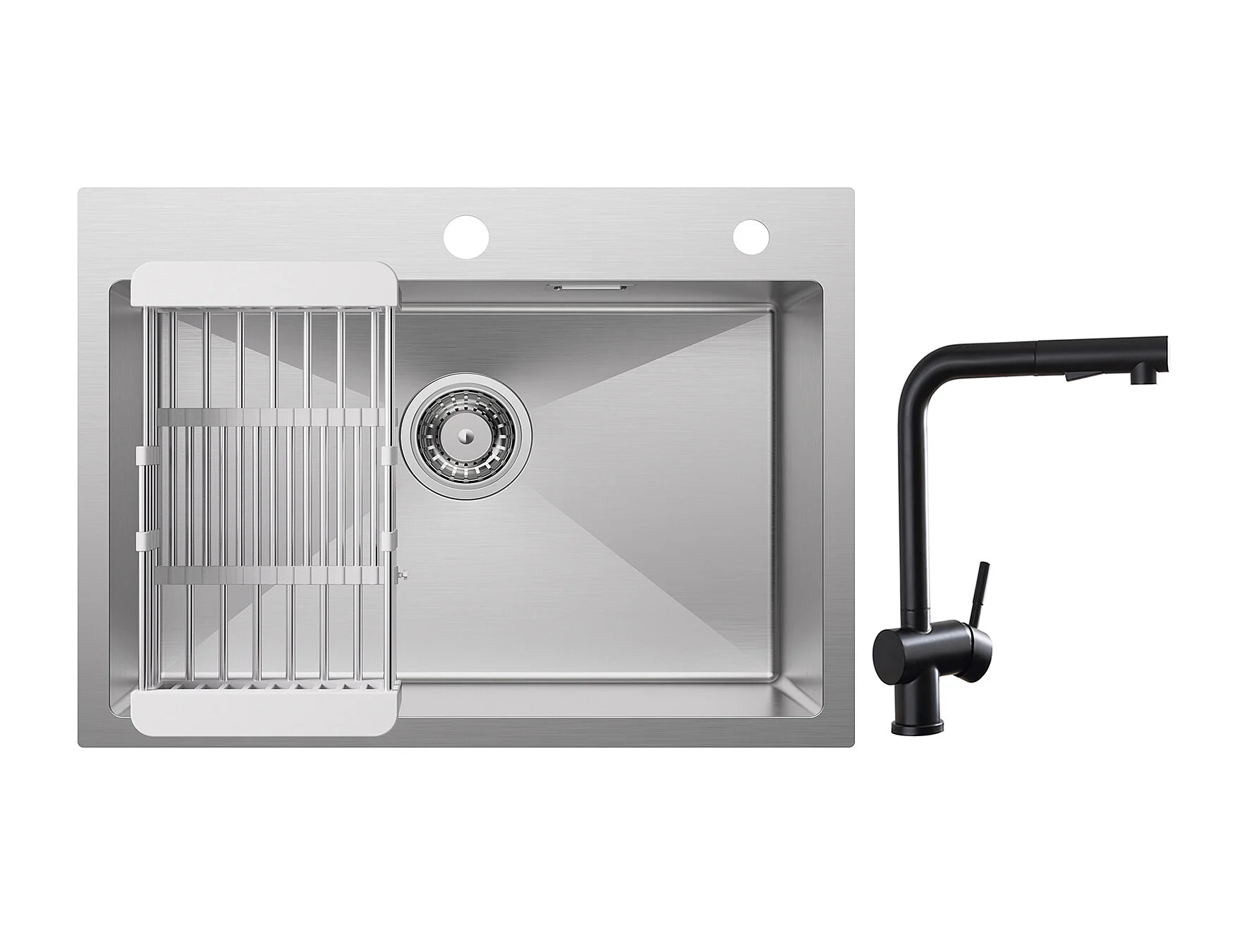 Cecipa max Fregadero de Cocina 1 Seno 60×45×18CM Fregadero de Acero Inoxidable Cepillado con Escurridor + Grifos con Ducha Extraíble, Mezclador de Fregadero Negro