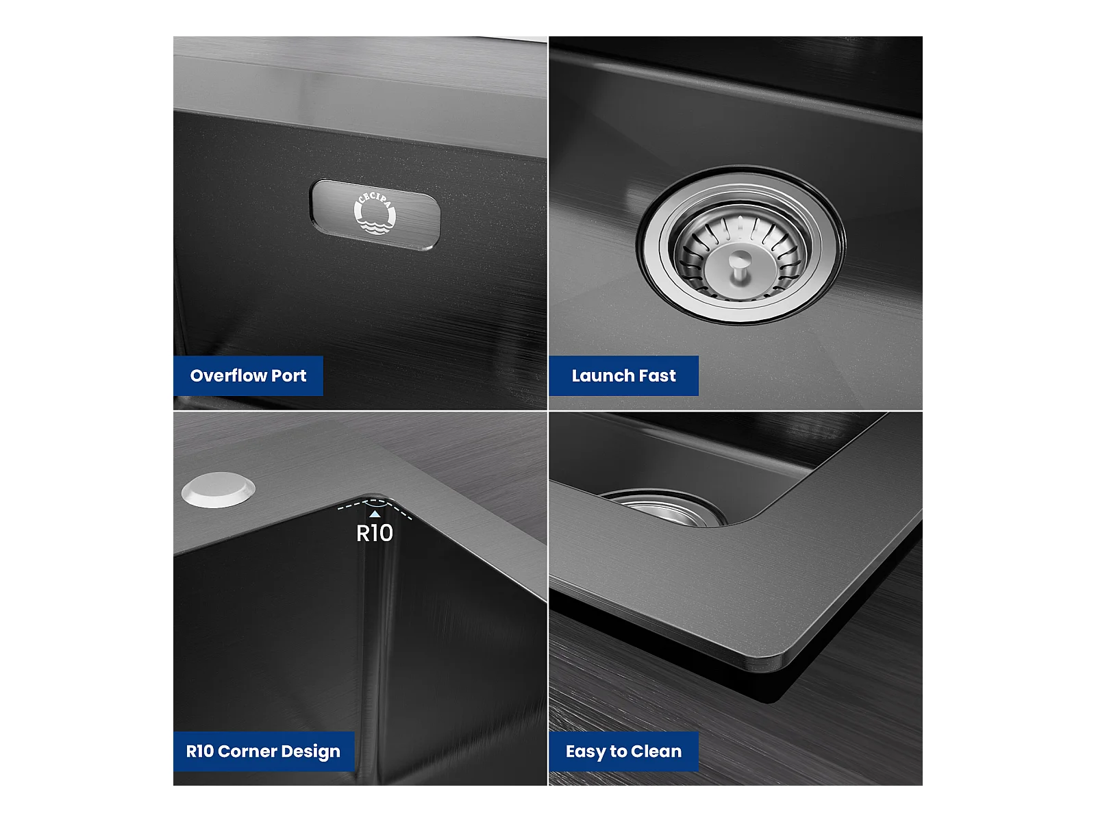 Cecipa MAX Fregadero de Cocina 1 Seno 50×45×18,5CM Fregadero de Acero Inoxidable Negro + Grifo Monomando con Ducha Extraíble, Cepillado