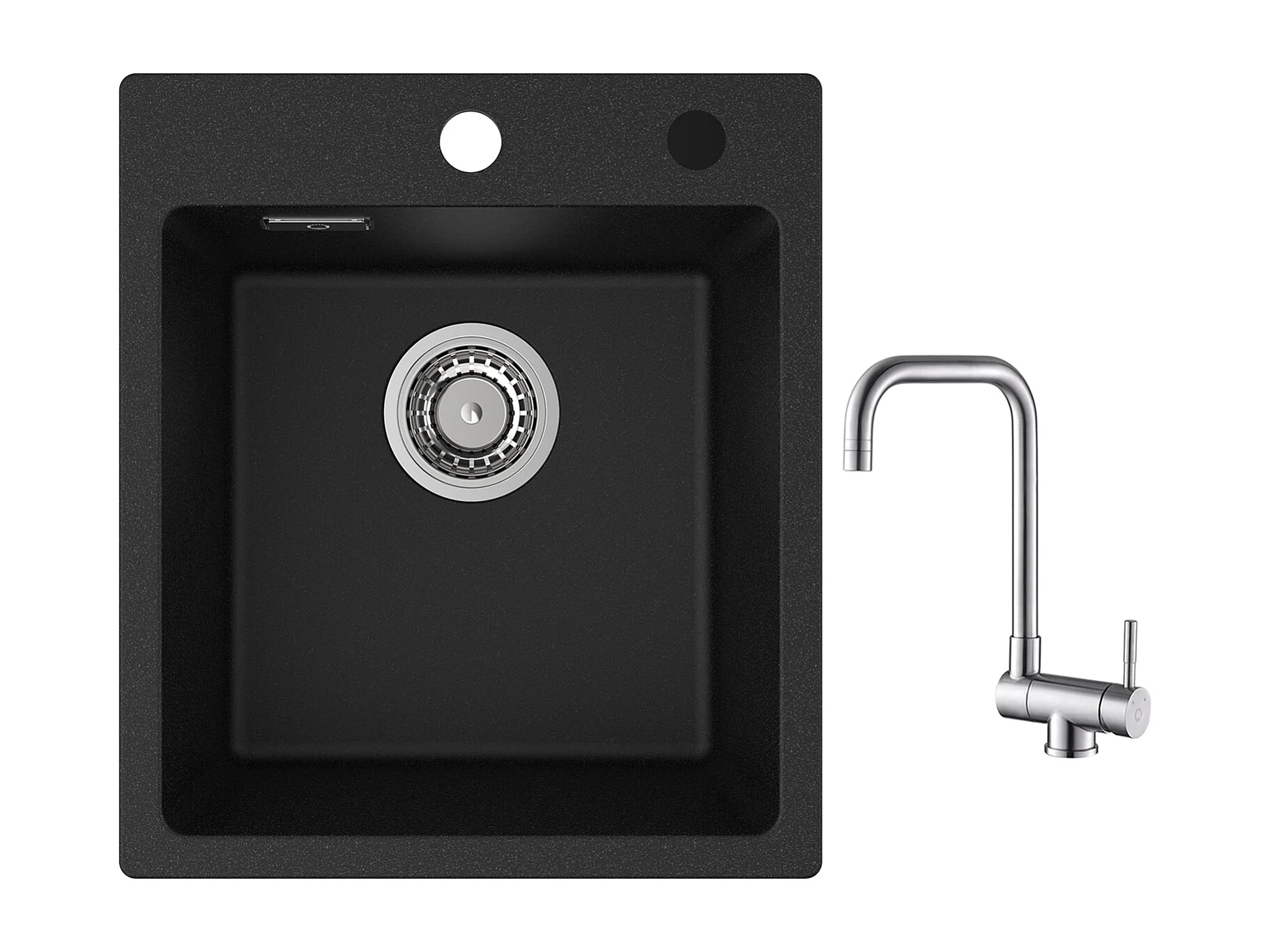 Fregadero de cocina Cecipa MAX 40x45 cm negro de cuarzo y resina 1 seno + mezclador de cocina de acero inoxidable cepillado