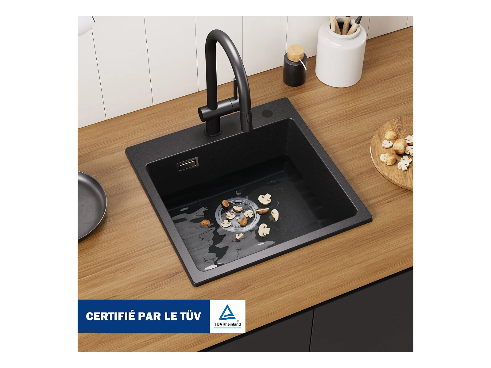 Fregadero Cecipa MAX 1 seno de cuarzo y resina negra 45x45 cm fregadero encastrable + Mezclador de lavabo giratorio 360° negro
