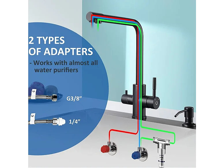 Cecipa max Grifo de Cocina de 3 Vías Negro, Mezclador de Cocina 3 en 1 para Sistema de Ósmosis + Dispensador de Jabón de Cocina Negro