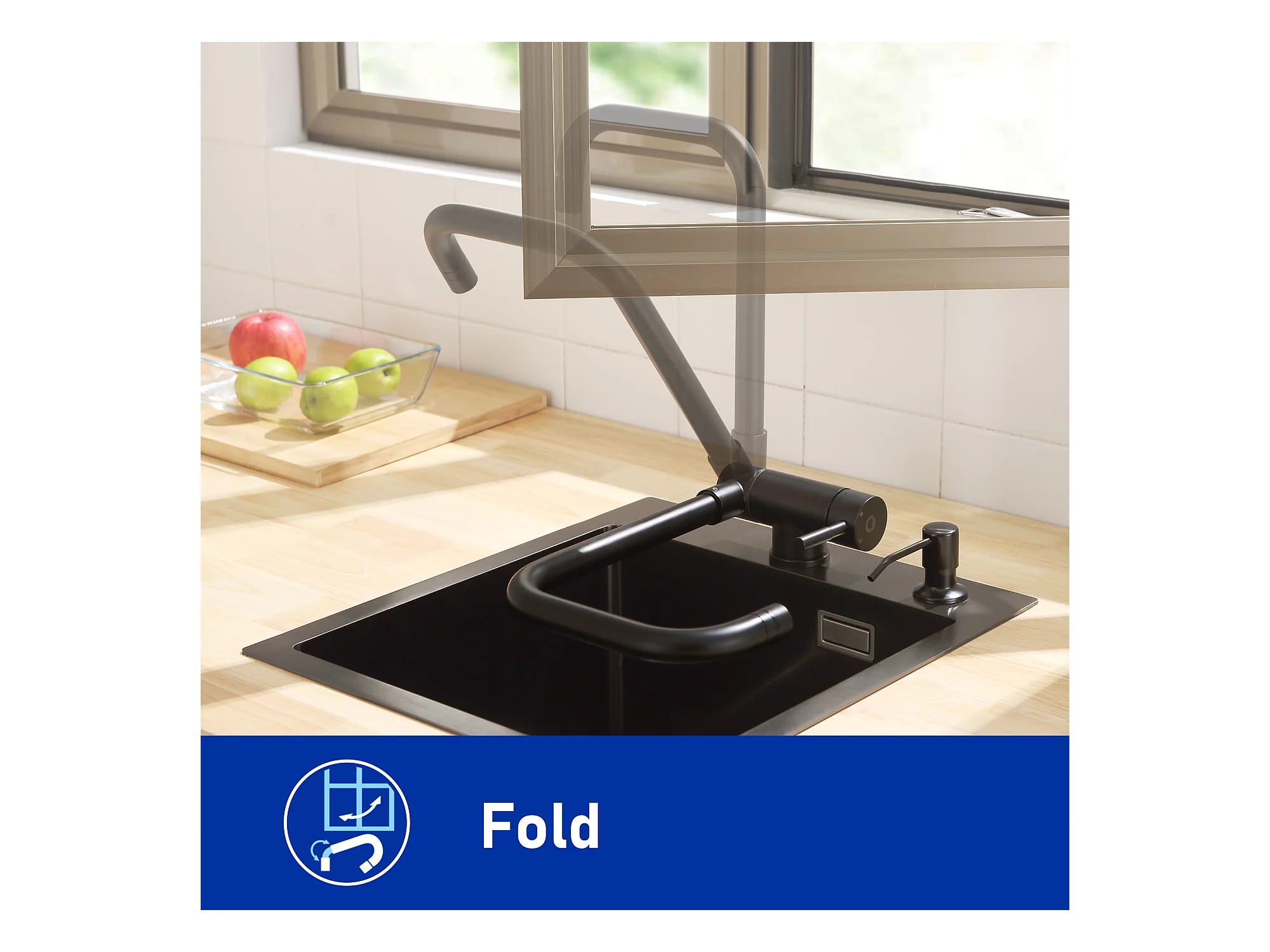Lonheo Max Mezclador de cocinaE Plegable Negro Giratorio de 360°, ,con Mango Plegable Contra Ventana, Acero Inoxidable, Agua Caliente/Fría,Modelo UE