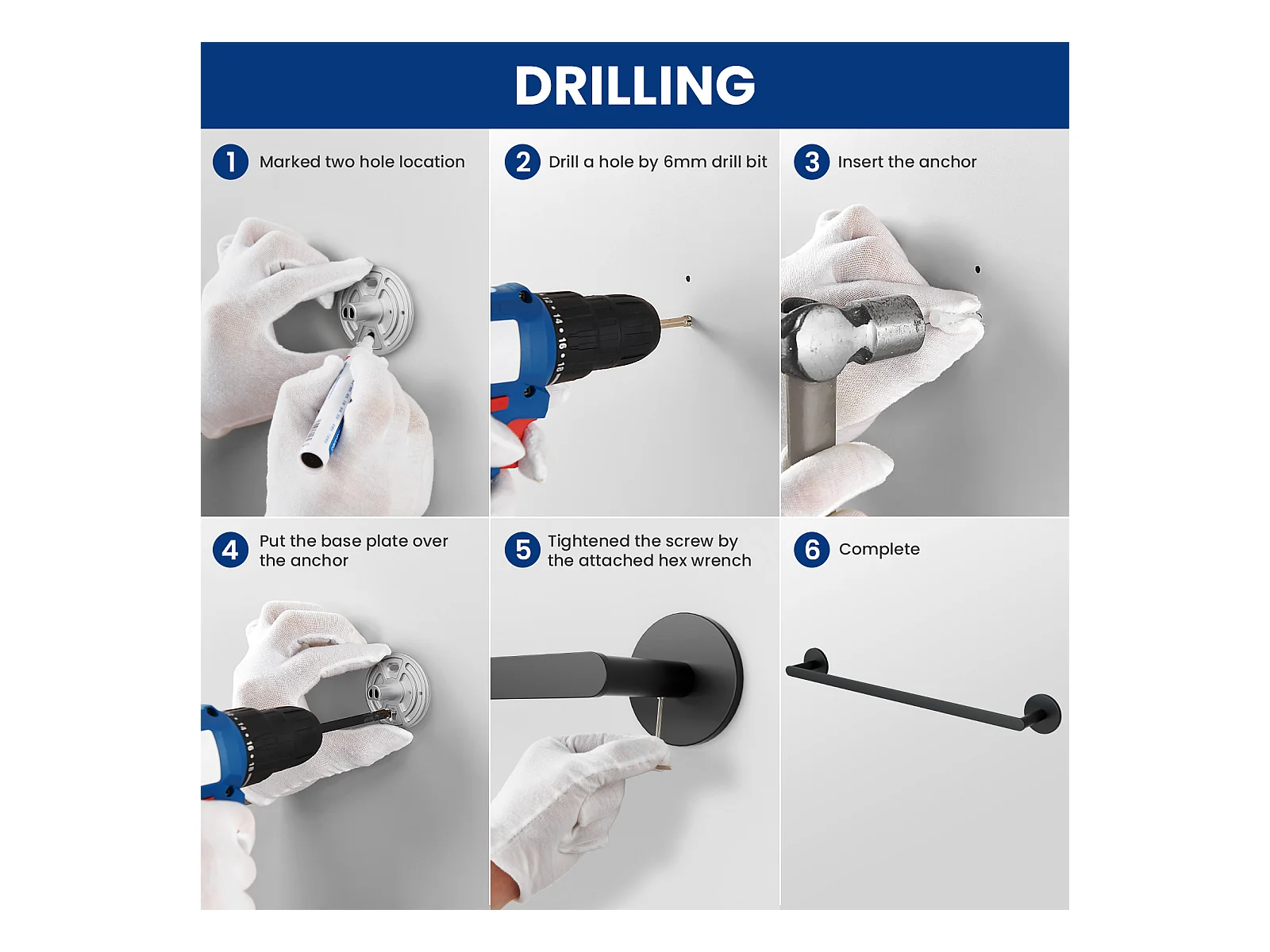 Juego de baño de 7 piezas: 1 toallero + 1 toallero lateral + 1 portarrollos de papel + 4 ganchos (negro)