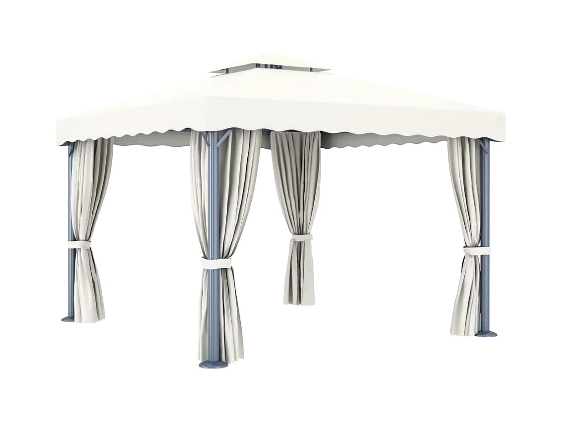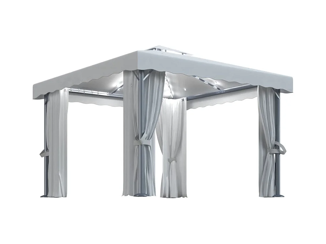 Cenador con cortina y tira de luces LED aluminio crema 3x3 m