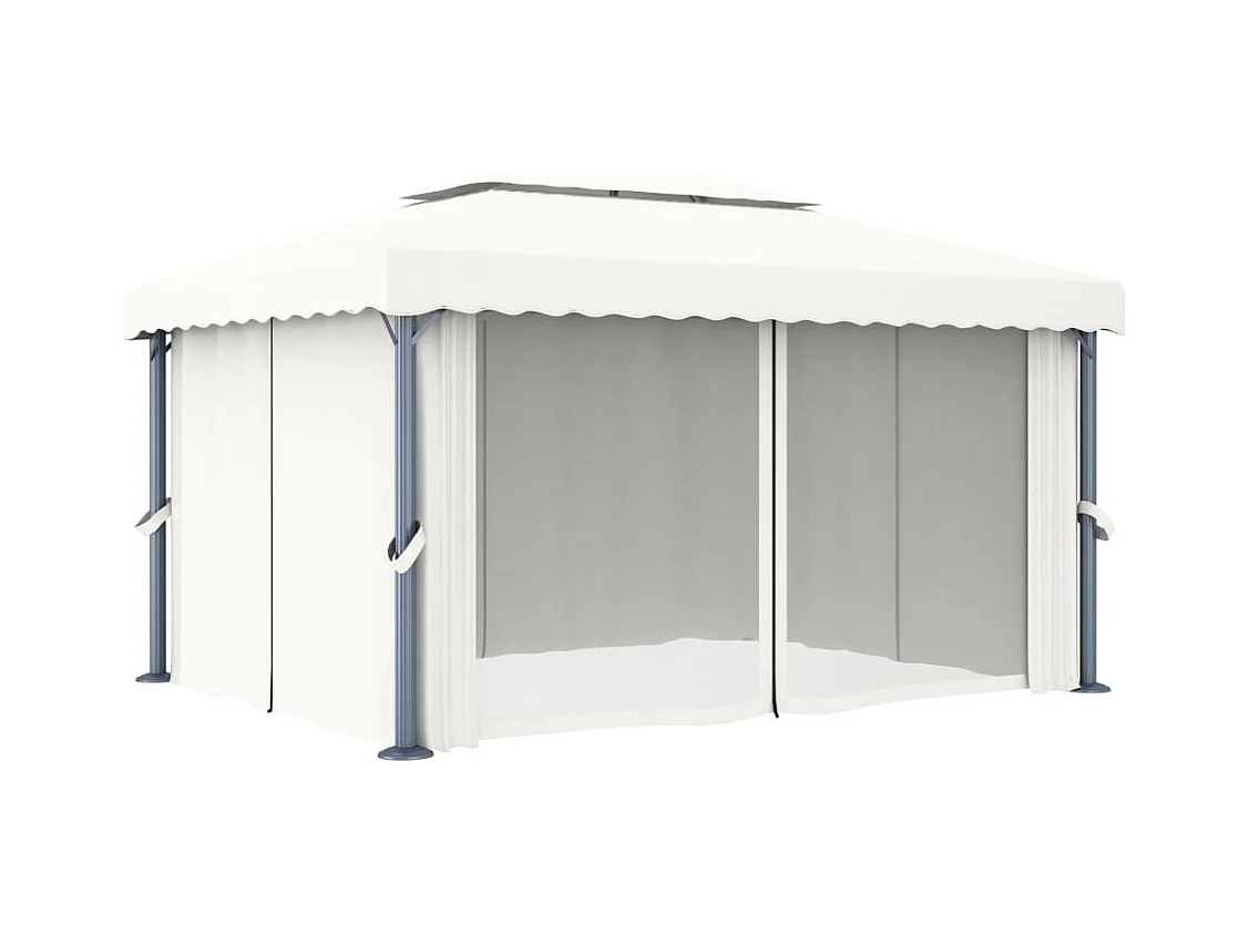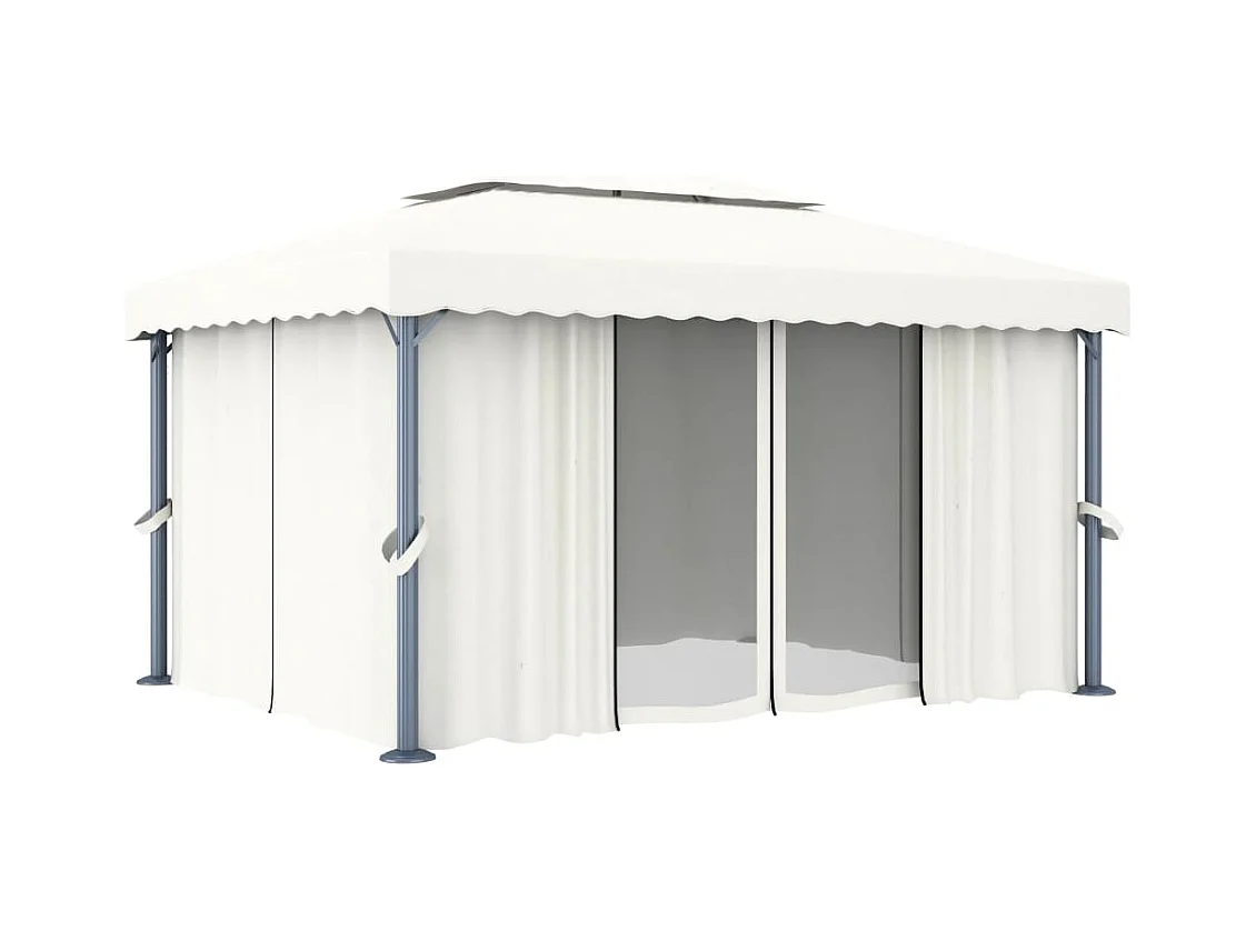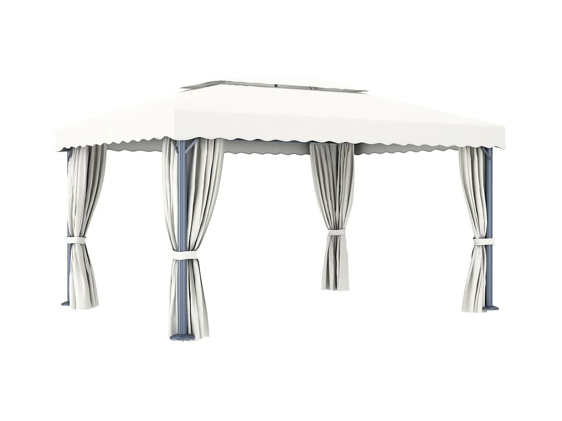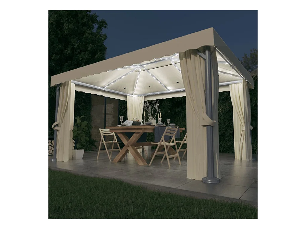 Cenador con cortina y tira de luces LED aluminio crema 4x3 m