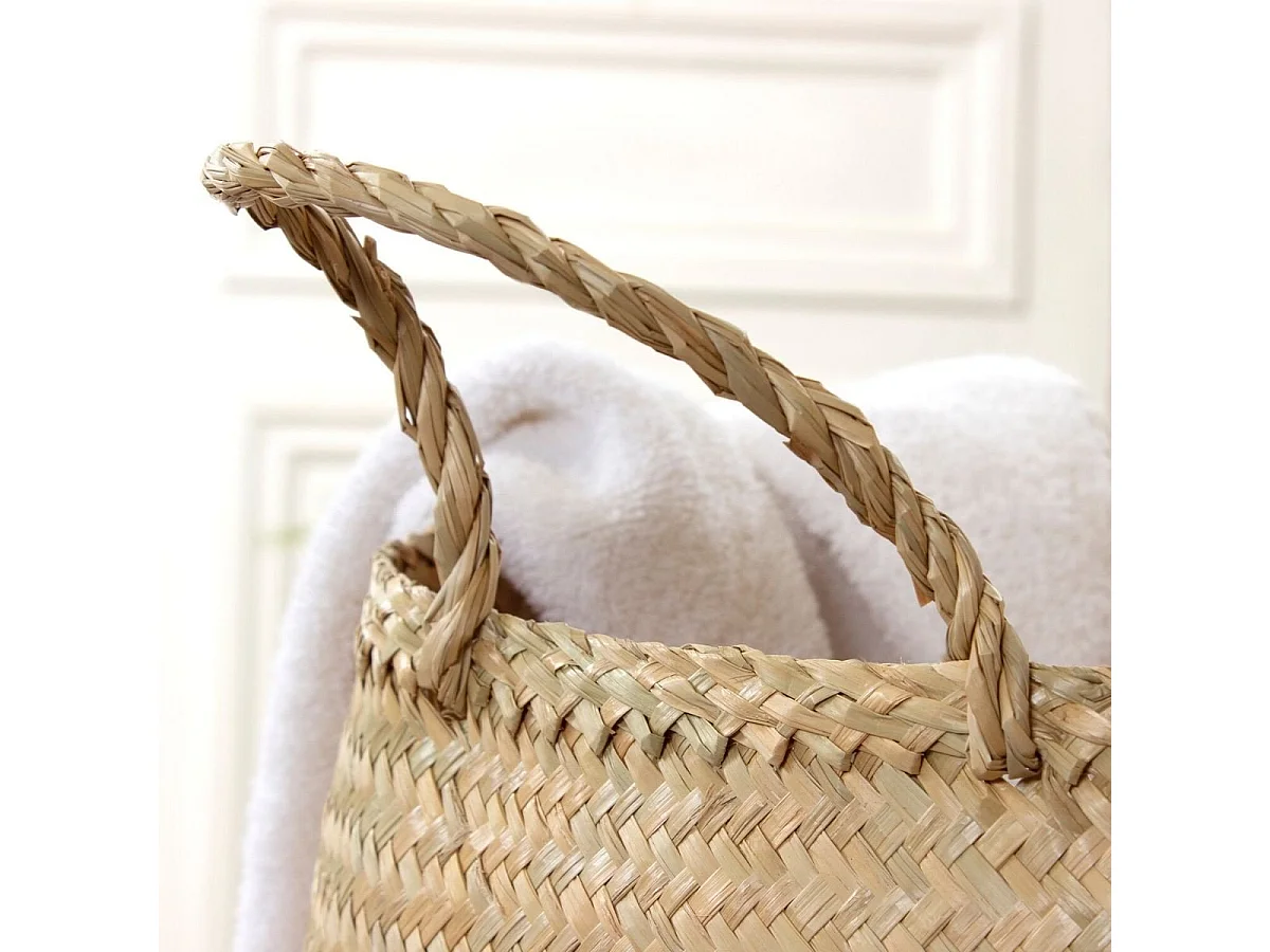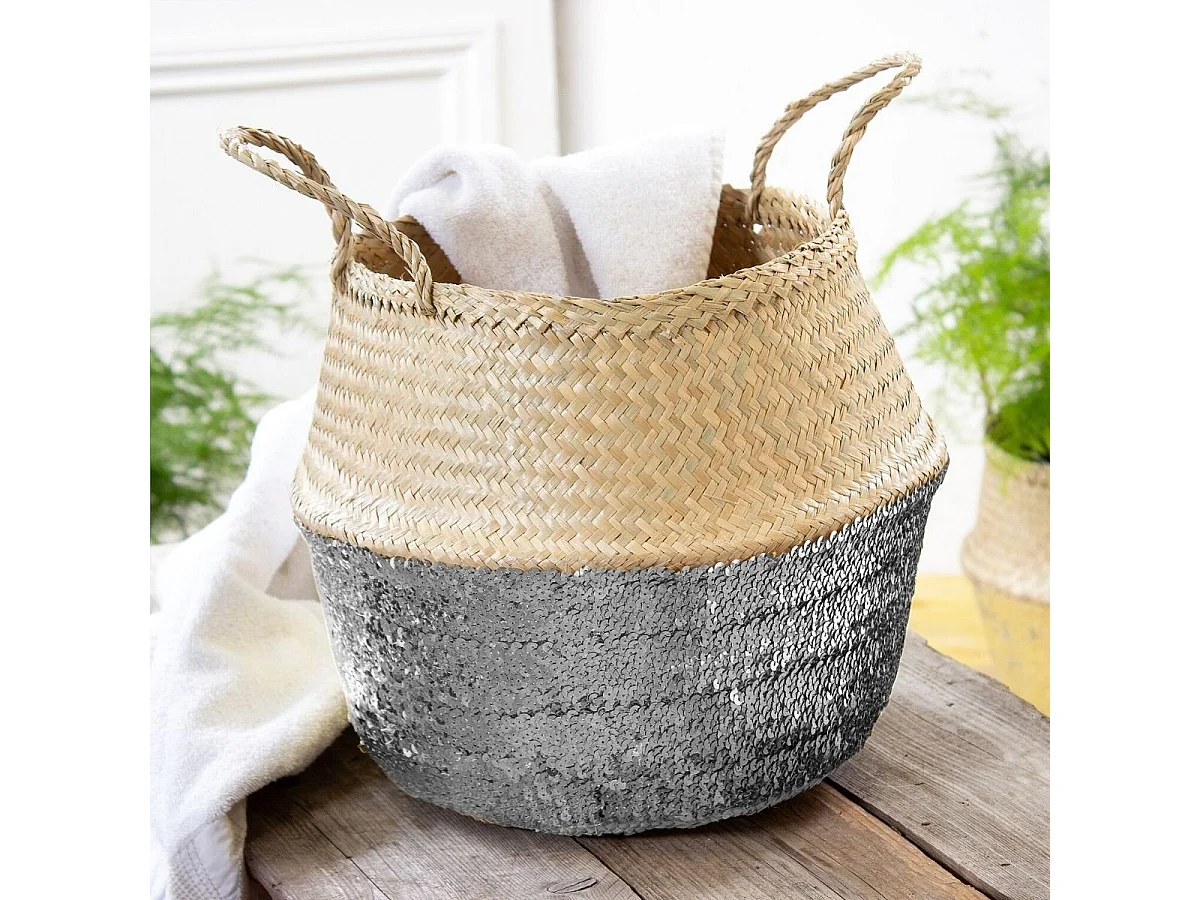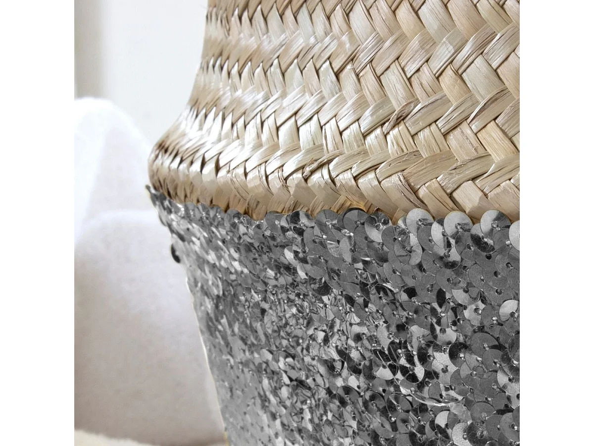 Cesta redonda trenzada junco marino lentejuelas plateadas