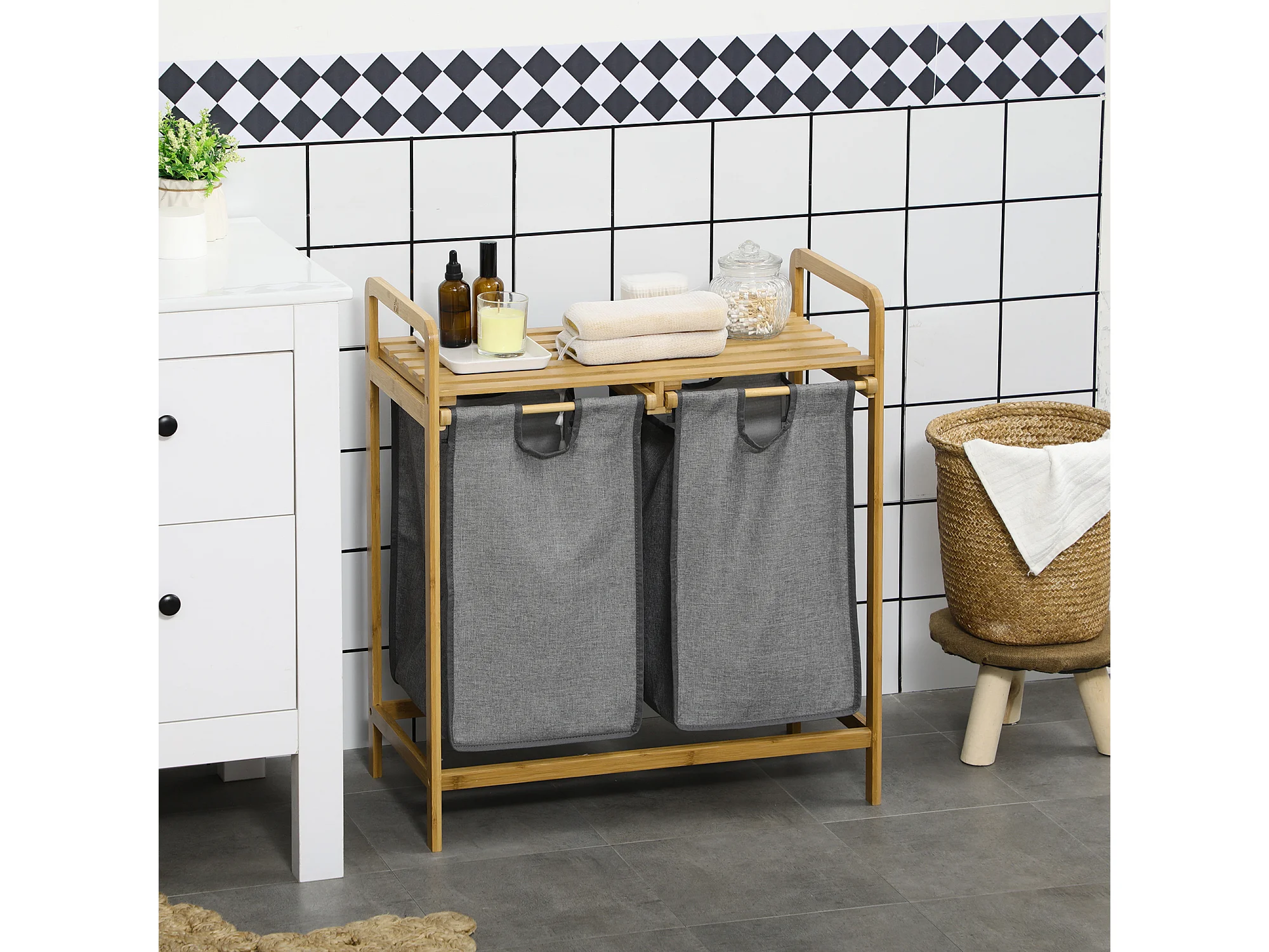 Cesto de ropa sucia Nalón Homcom 2 compartimentos + estante superior bambú gris/natural 73x33x64 cm