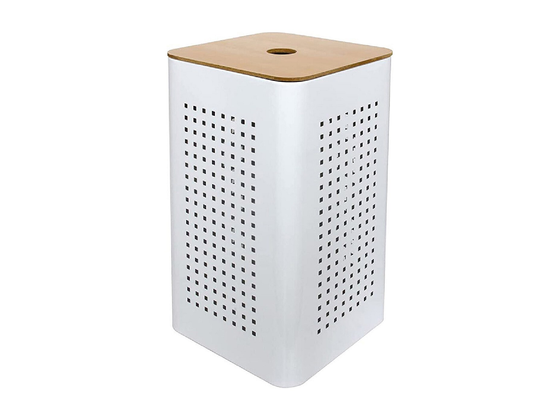 Cesto de ropa de metal blanco con tapa de madera