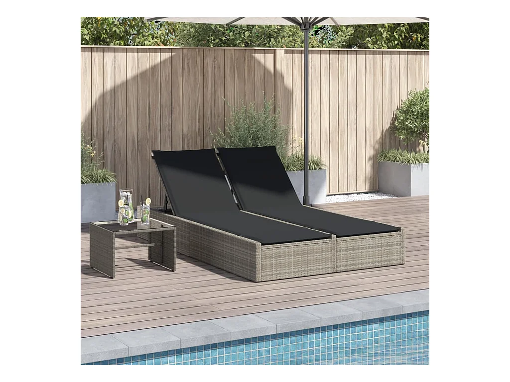 Conjunto de 2 tumbonas con toldo y mesa en ratán gris claro