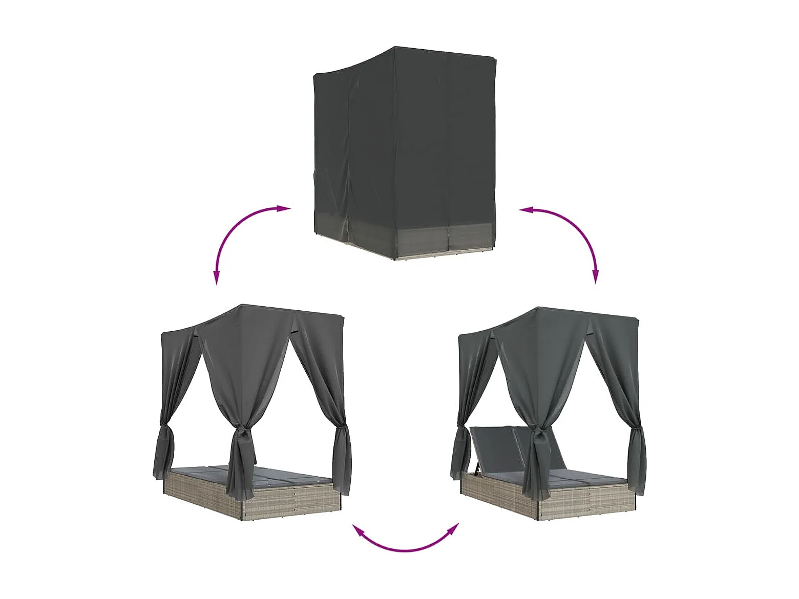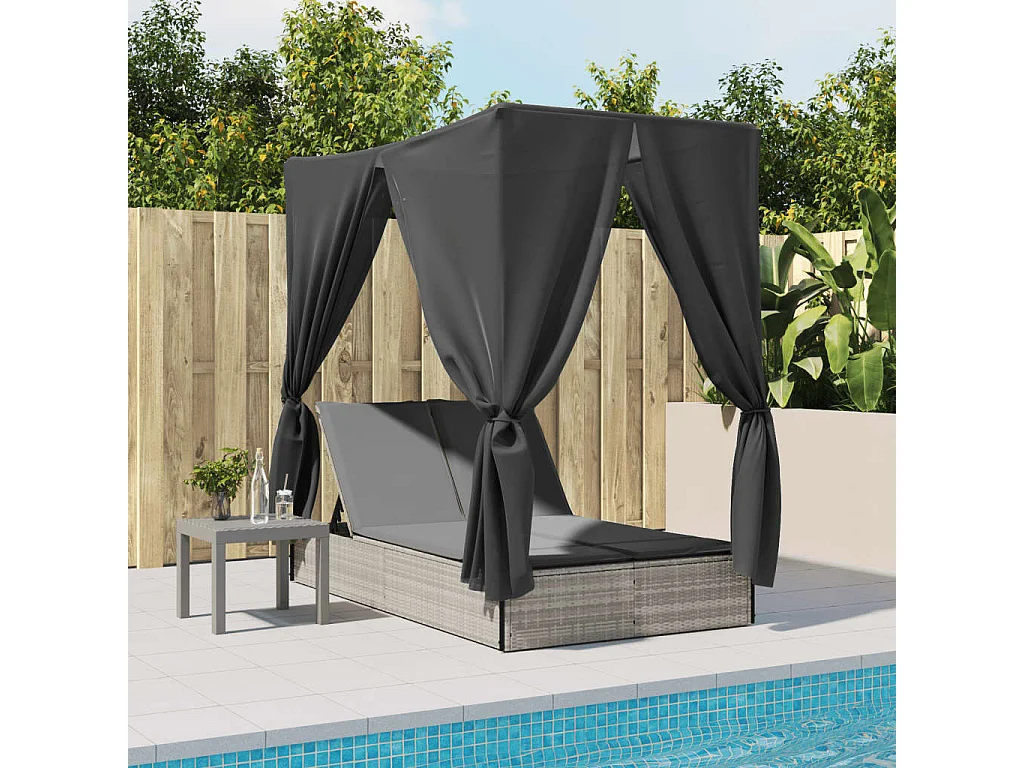 Chaise longue doble con techo y cortinas de resina tejida en color gris