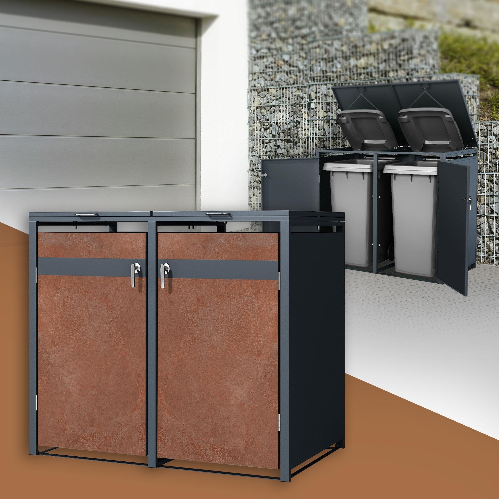 ML-Design Cobertizo de exterior para 2 cubos de basura de 132x80x116,3cm antracita y marrón óxido cubre contenedor con tapa, puerta y cerradura