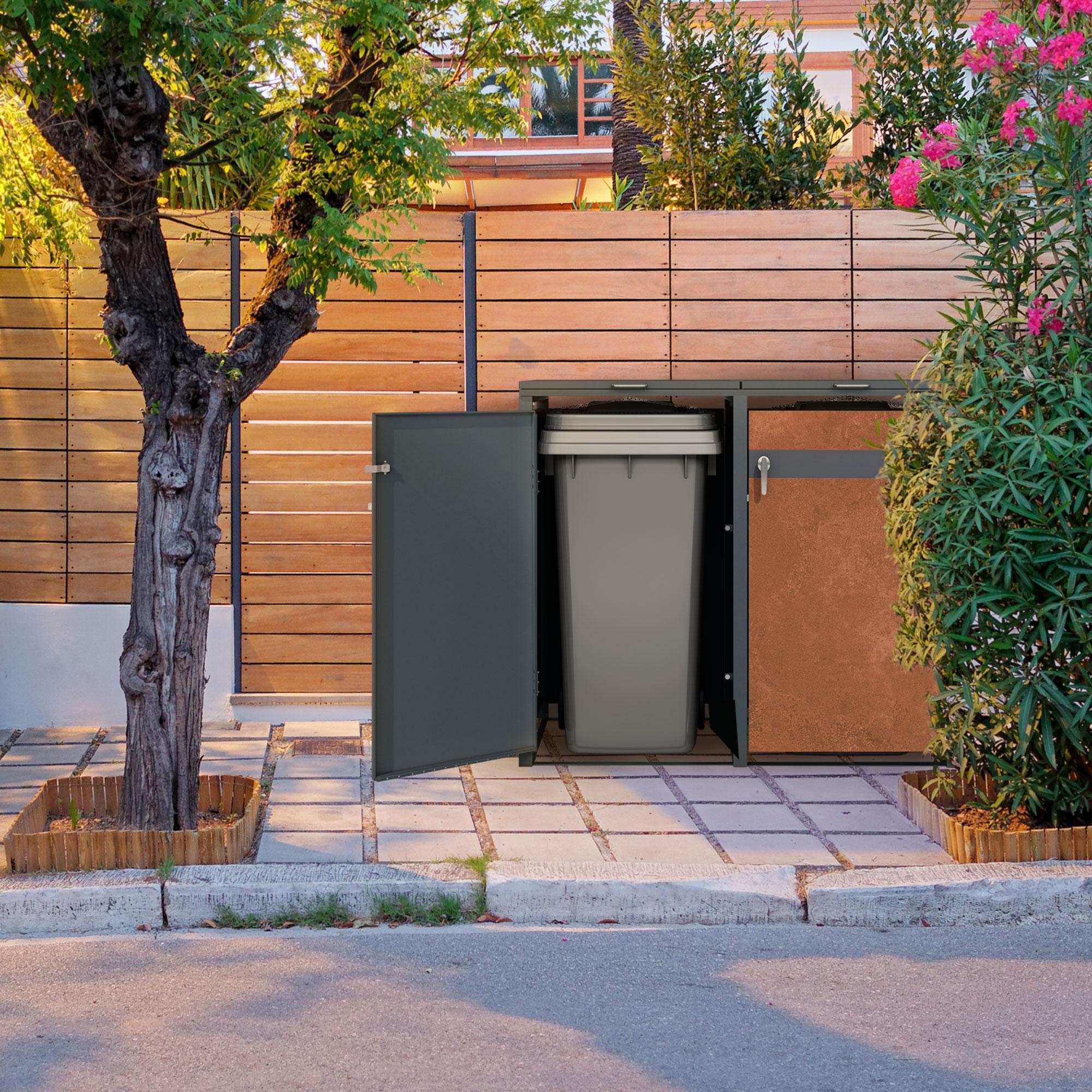 ML-Design Cobertizo exterior para 2 cubos de basura 240L 132x80x116,3cm antracita caseta de acero acabado óxido con tapa abatible y puerta