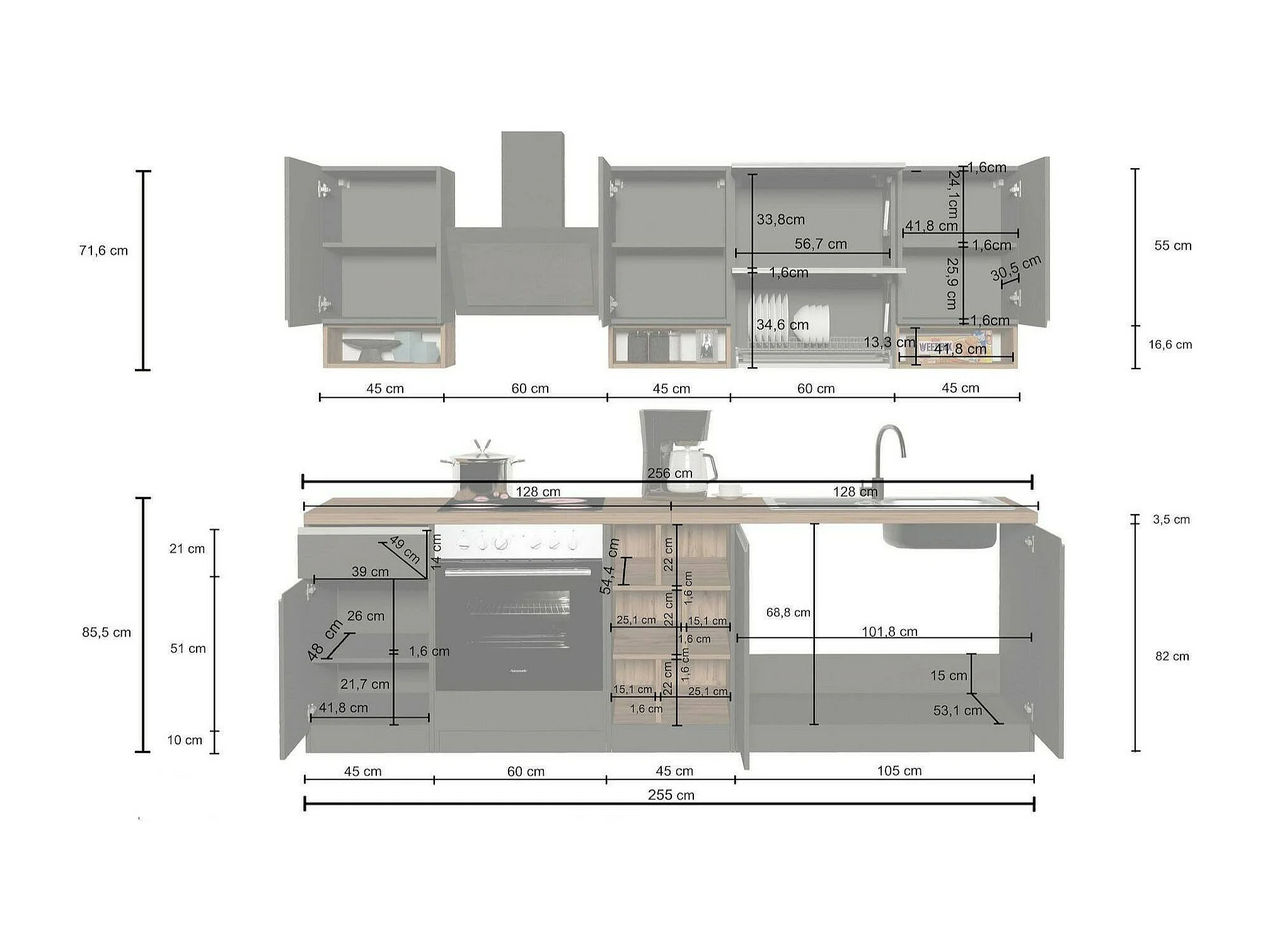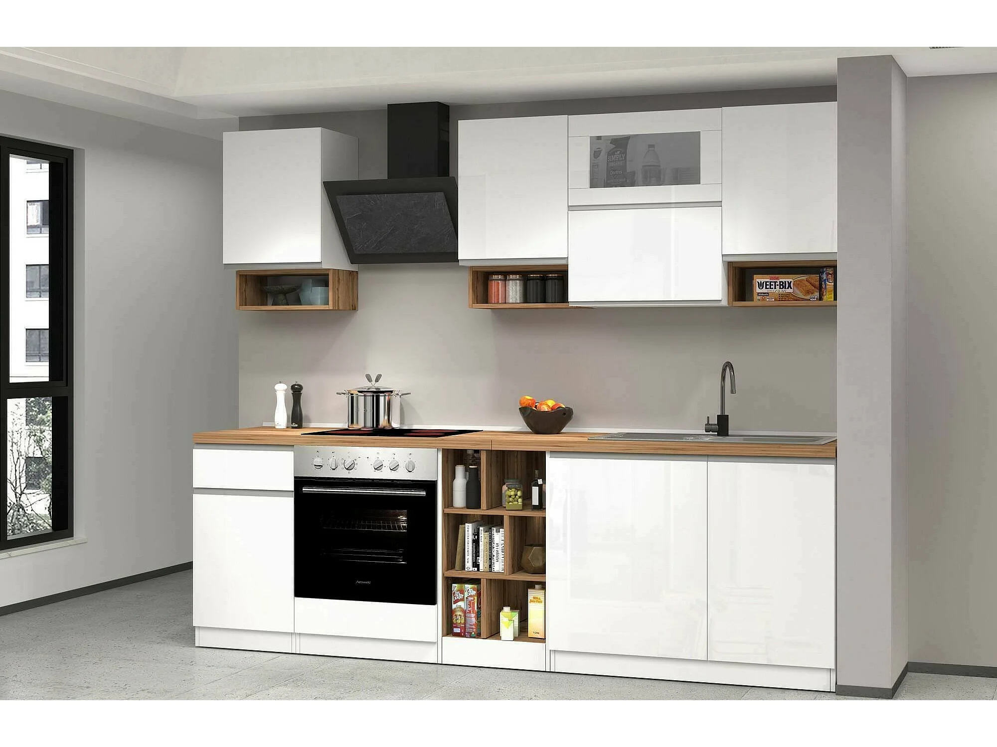 Cocina completa Dceccaron, Set con despensa, Mueble cocina, Kit bloque lineal, 100% Made in Italy, 255x60h85 cm, Blanco brillo y roble