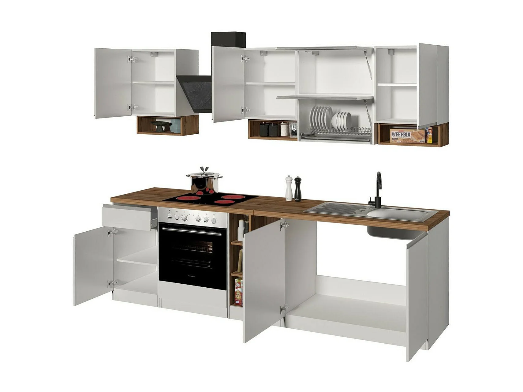 Cocina completa Dcastill, Set con despensa, Mueble cocina, Kit bloque lineal, 100% Made in Italy, 255x60h85 cm, Blanco brillo y roble