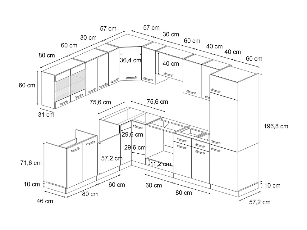 Cocina esquinera roble azul-gris-dorado 287x46x81.6 r-line