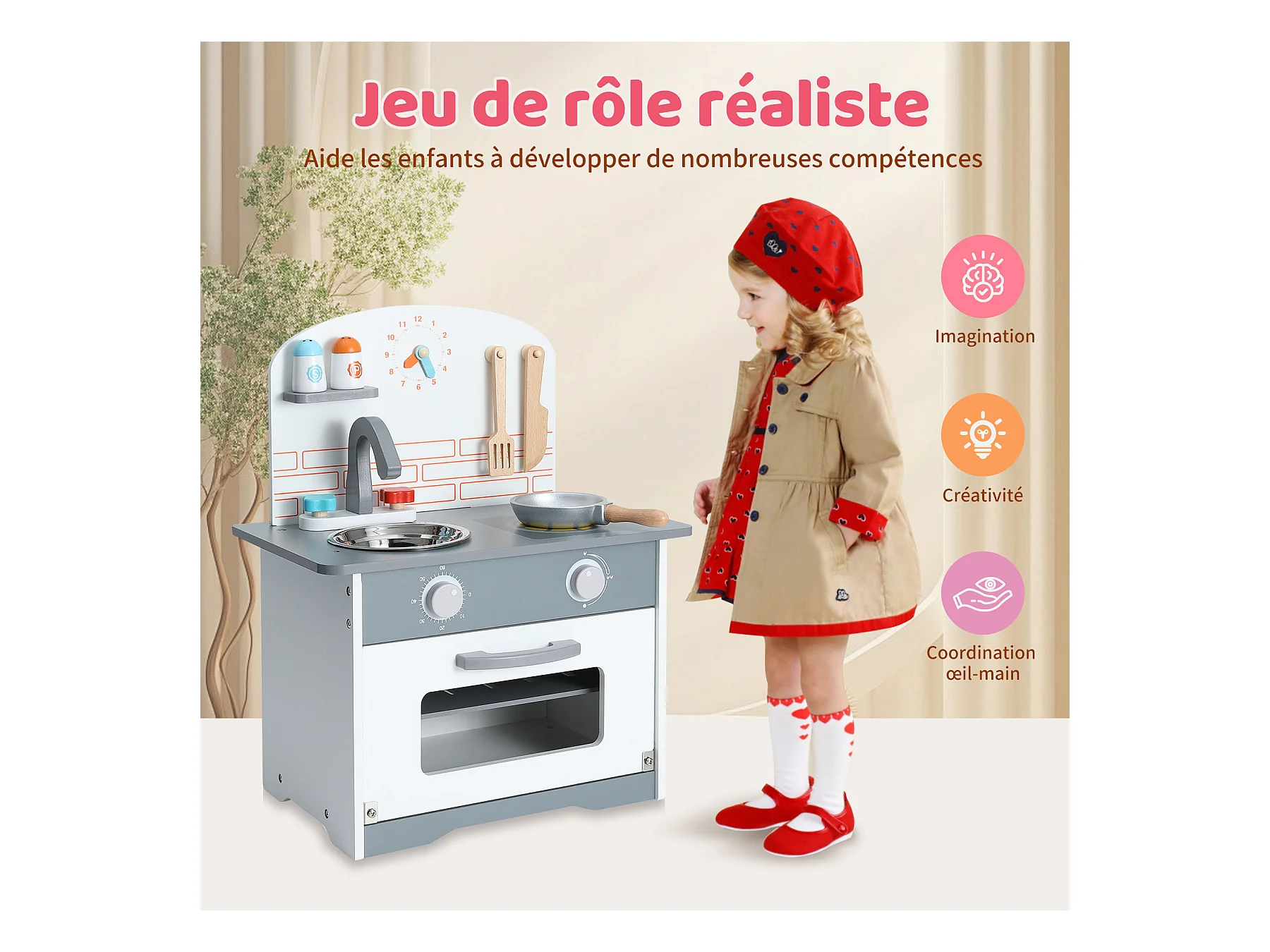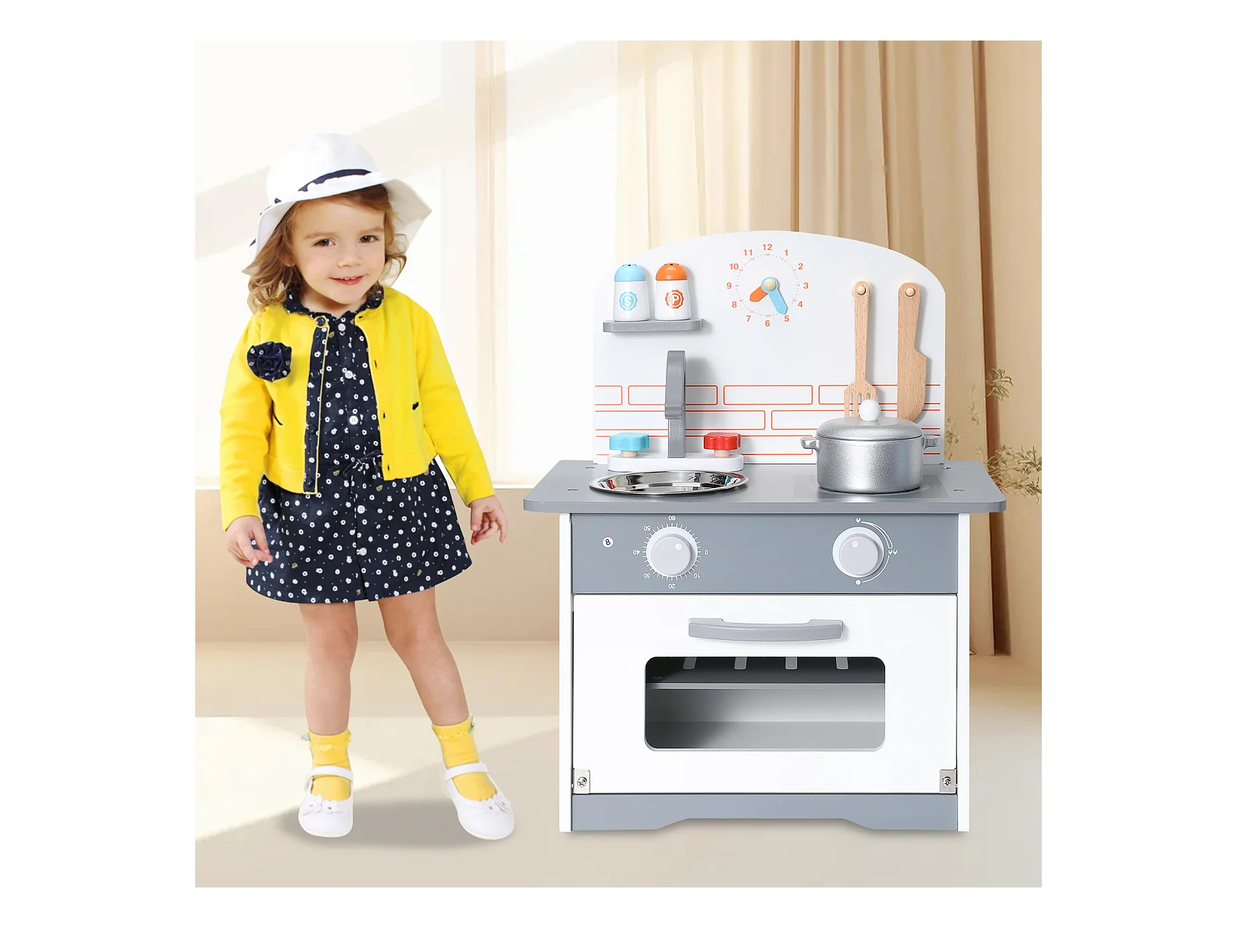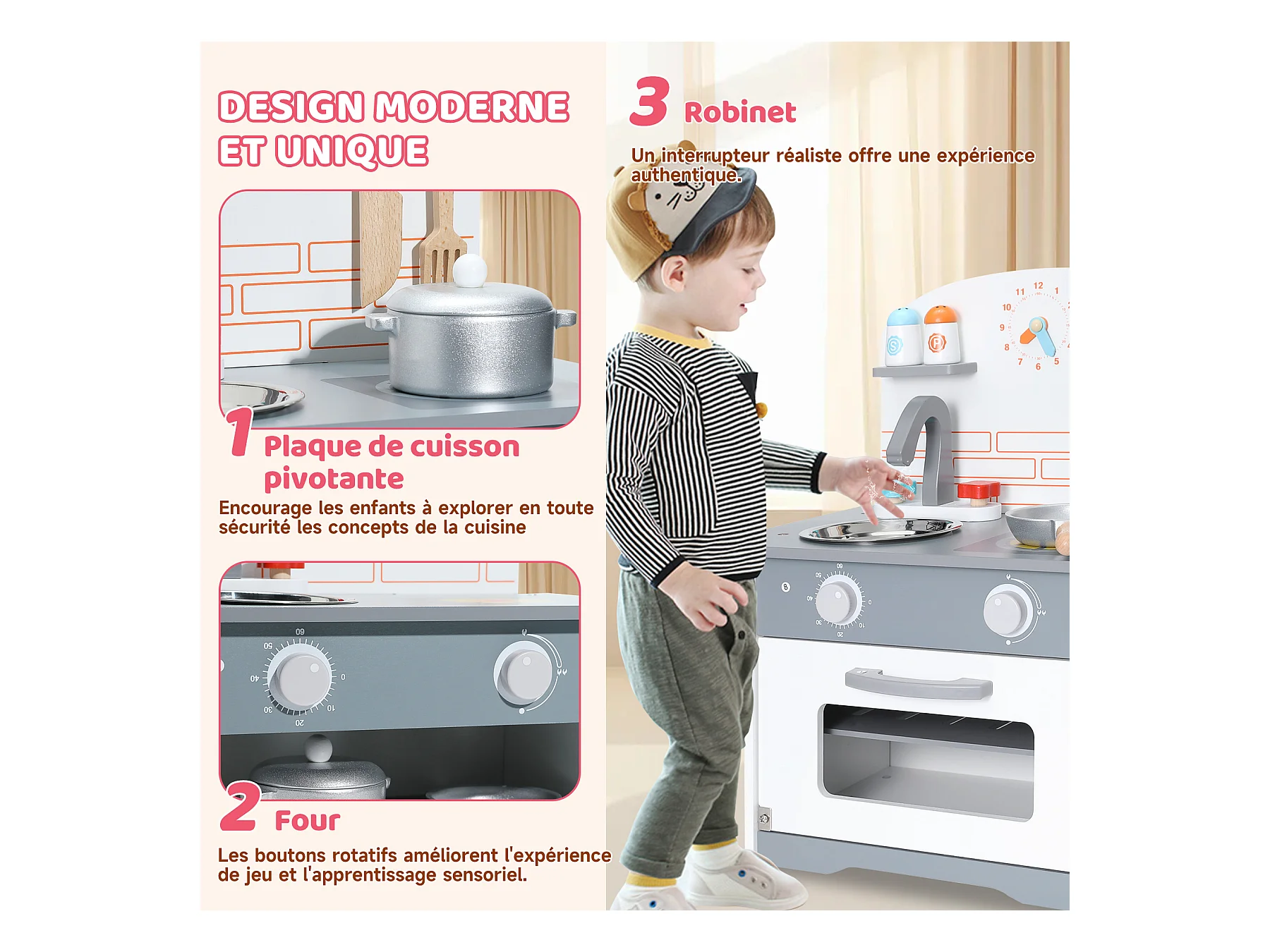 Cocina infantil multifuncional - ORYXEARTH - 40x24,5x50cm - Madera - Espátulas y sartenes - Gris