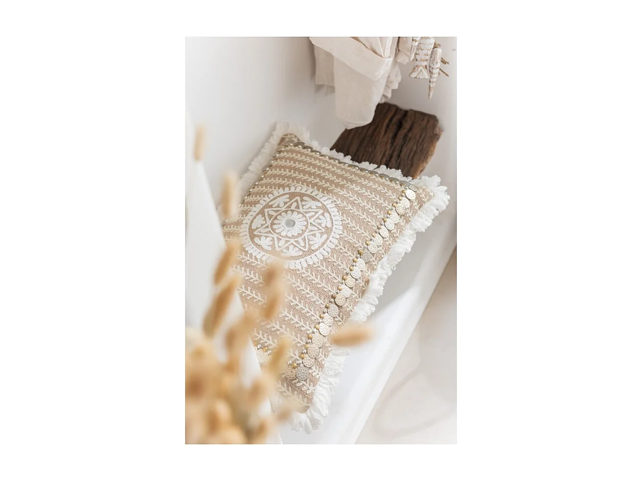 Cojín rectangular con borde de flecos y motivos de yute natural 49x31cm