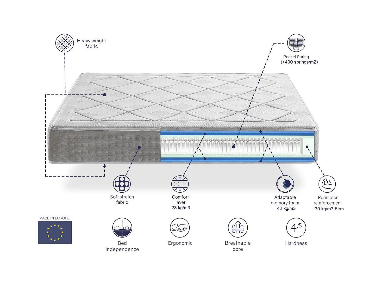 Colchon de muelles ensacados 120X190 CORAL, Altura 25 CM, Antiestress, Viscoelástica, Ergonómico. DORMISSIMO