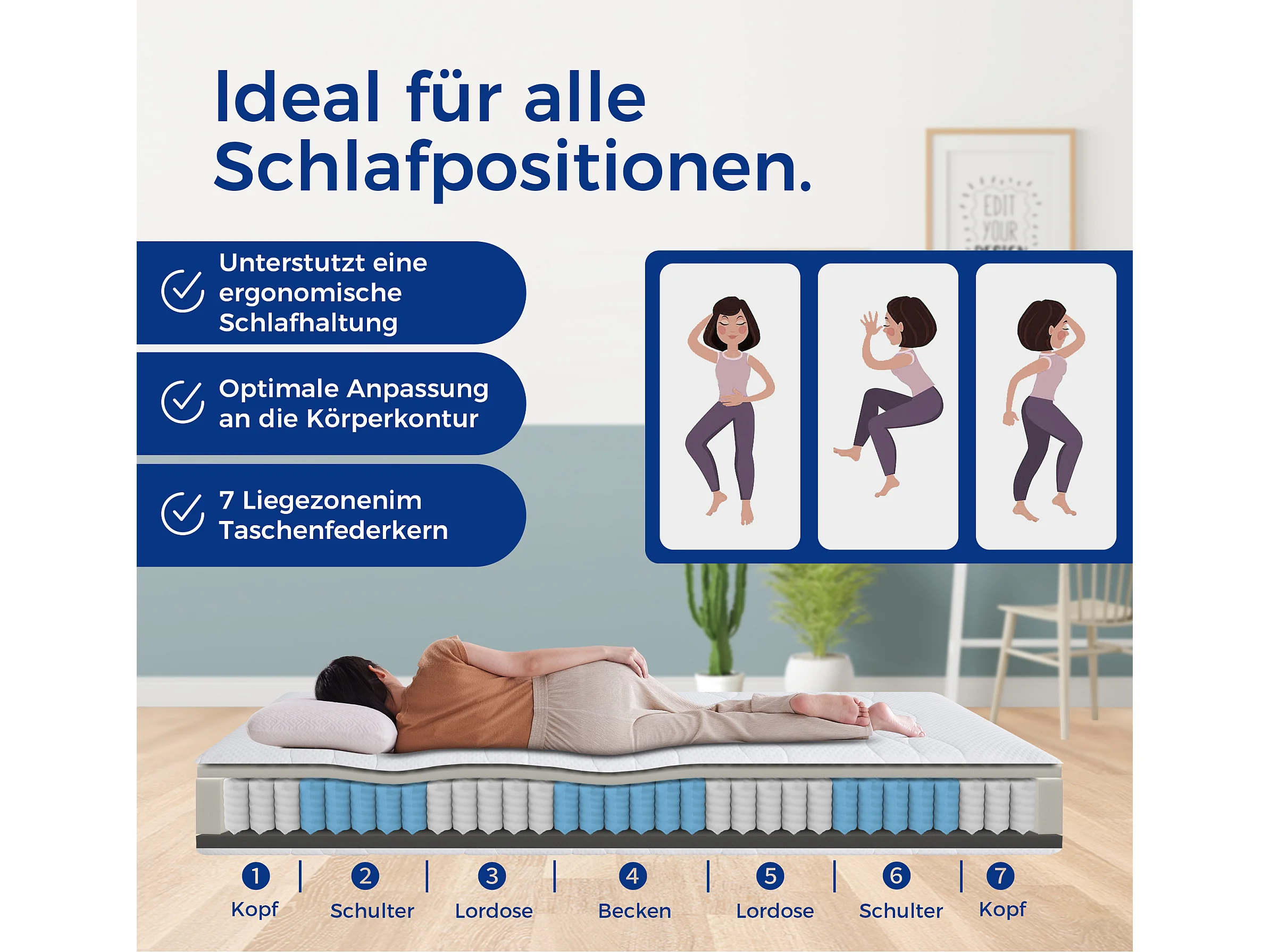 Colchón de muelles ensacados H3 180x200 cm, 7 zonas ergonómicas, 20 cm de altura, certificado Öko-Tex - Confort óptimo y soporte firme para un mejor descanso.