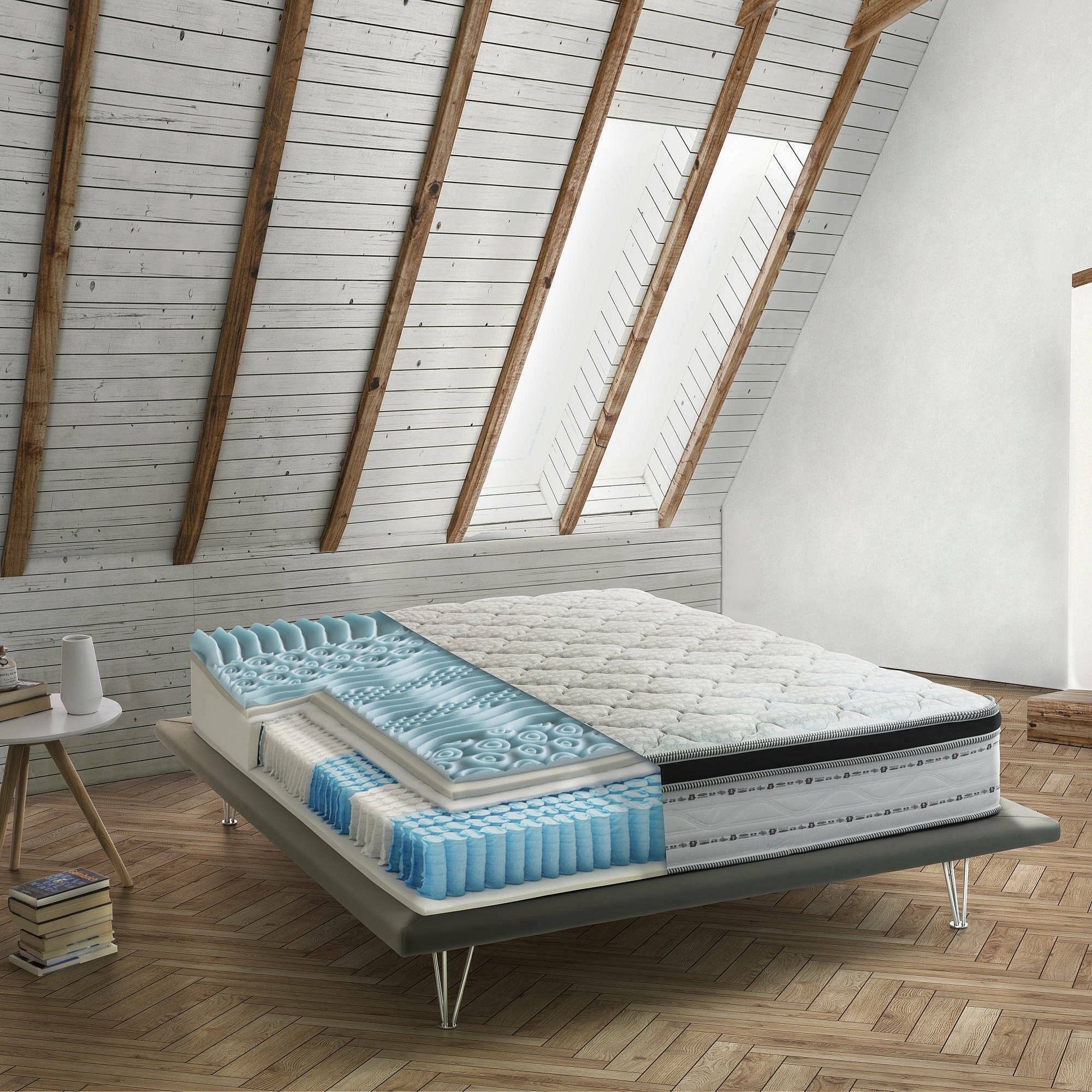 CARACTERÃSTICAS TÉCNICAS - Altura total del producto: 27 cm - Colchón con 9 zonas de descanso con capacidad diferenciada - Capa de 5 cm de Memory Foam, 55 kg por metro cúbico - Capa de 1 cm de Memory Gel - 800 muelles ensacados - Producto con Oeko Tex internacional certificación que garantiza la ausencia de sustancias nocivas para el ser humano y el medio ambiente.
