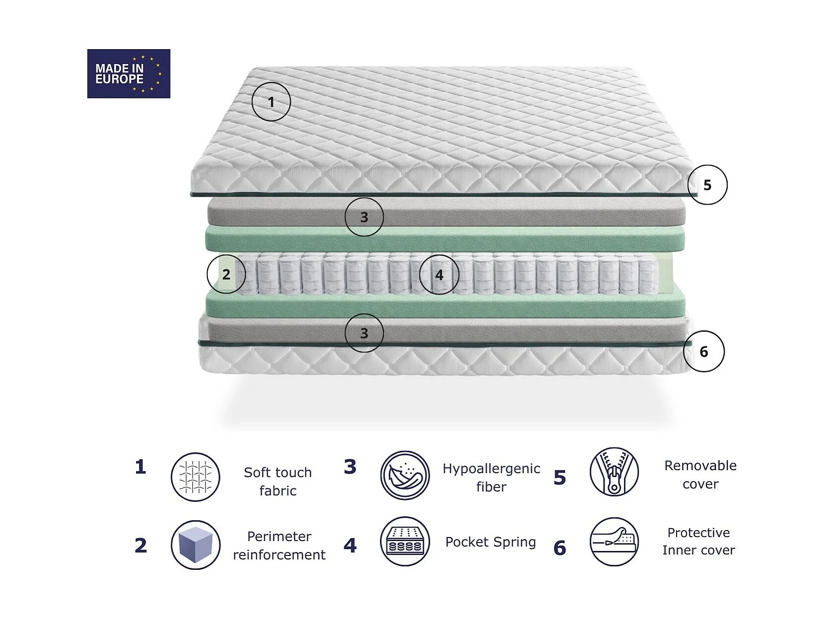Colchon Muelles Ensacados 135X180 ELBA, Altura 24 CM, 7 zonas de confort. Desenfundable. Higiénico y transpirable
