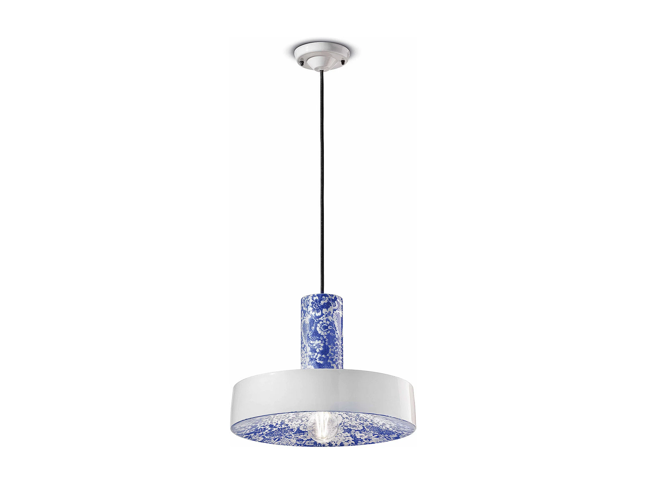 Sospensione Grande Vintage Decò Pi Ceramica Ming Blu 1 Luce E27