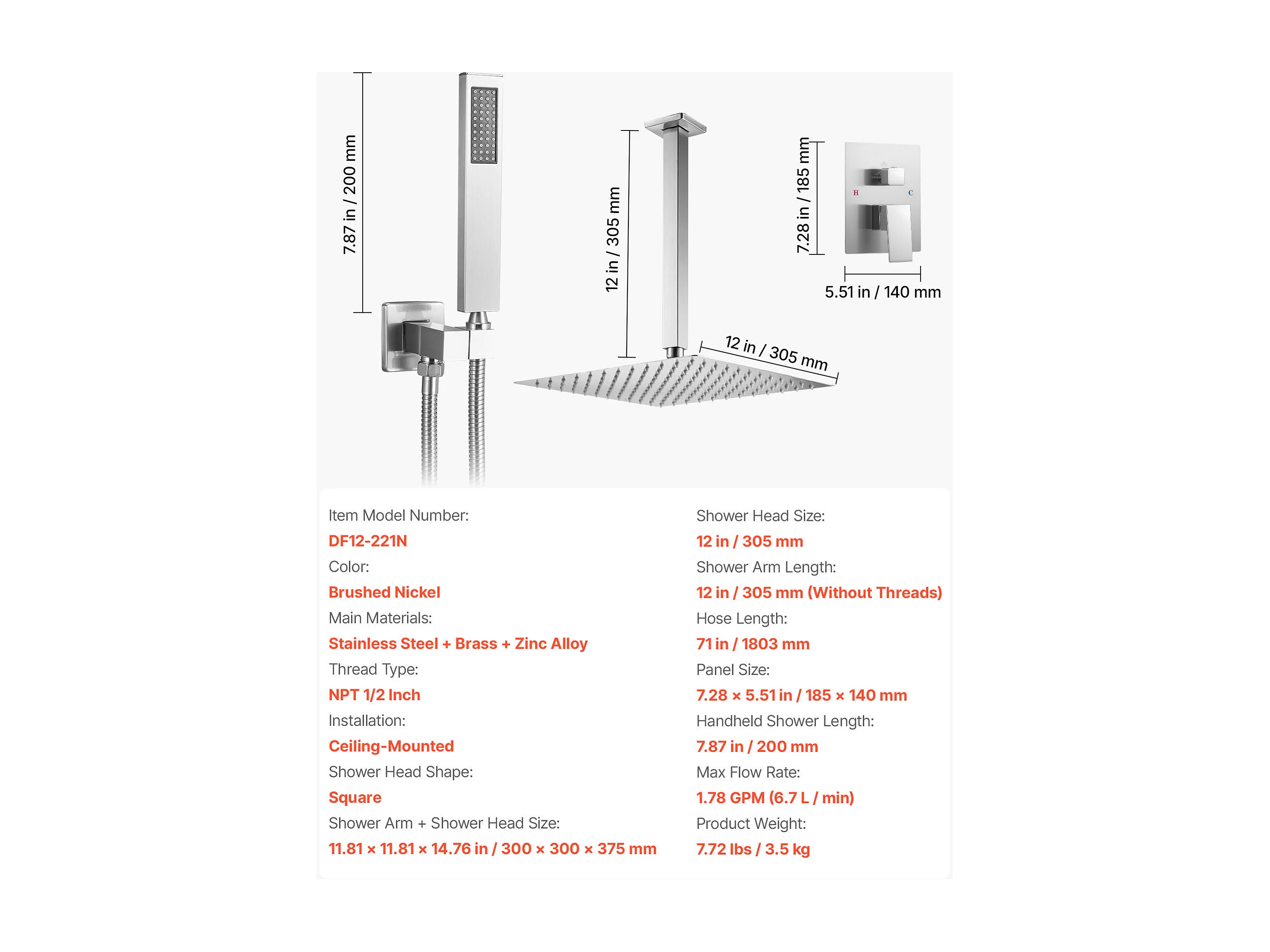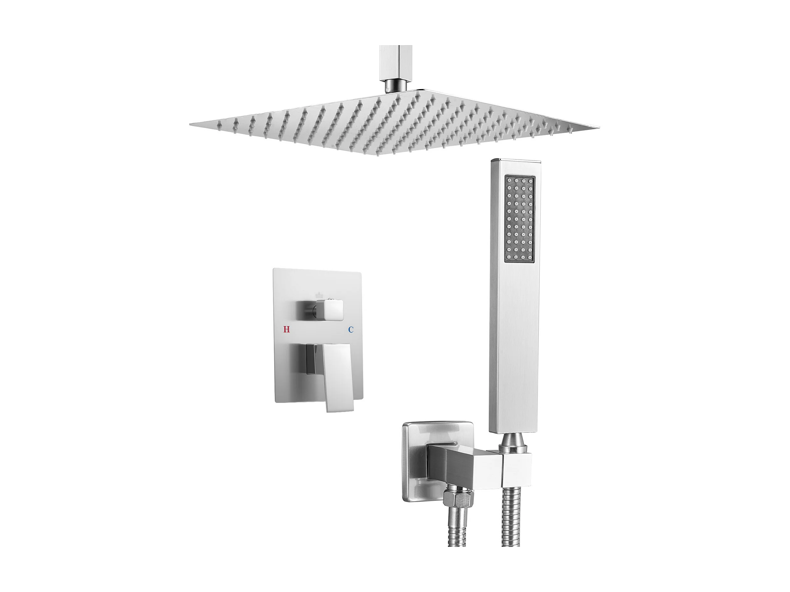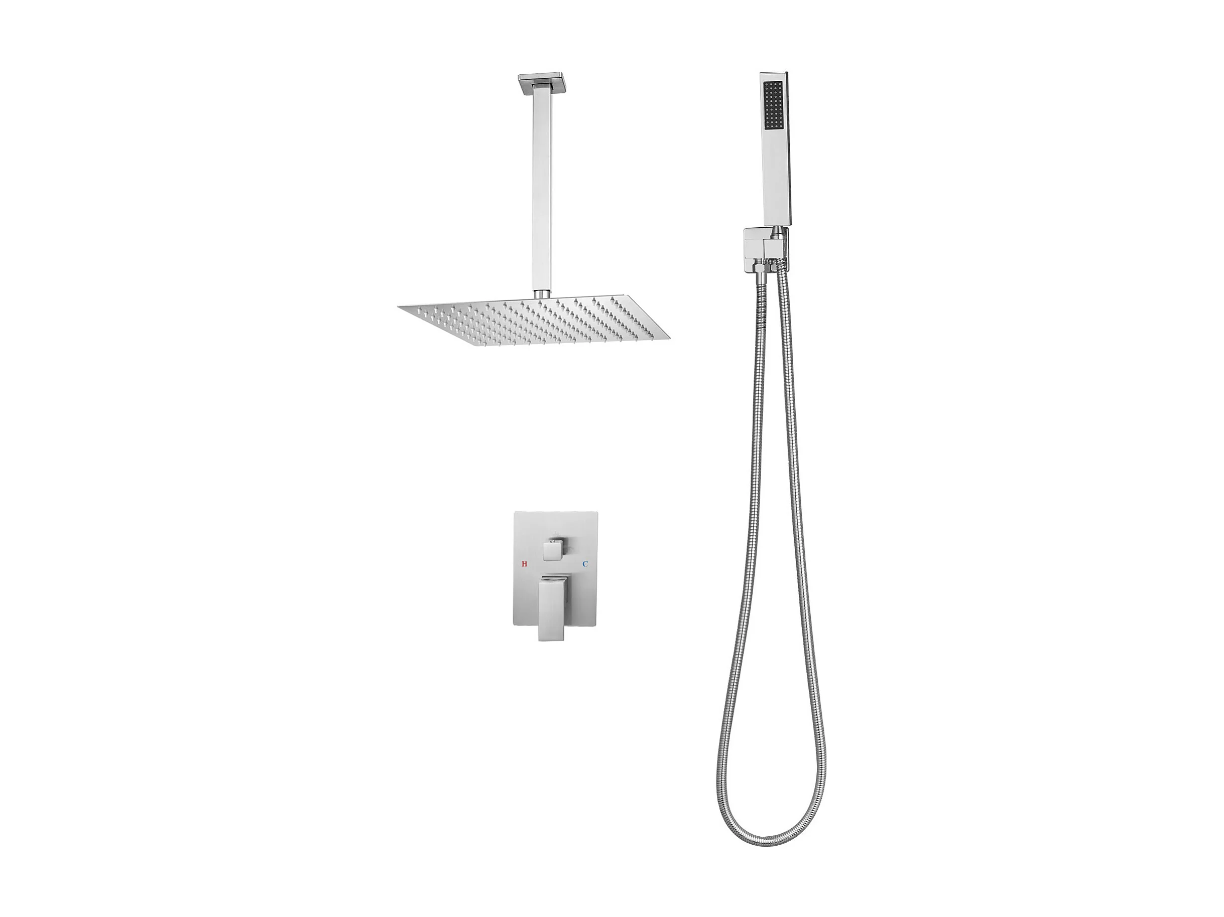 Columna de Ducha SucceBuy Kit de Ducha, Sistema de Ducha con Rociador Cuadrado de 305 mm, Teleducha, Montaje en Techo, Acabado en Níquel Cepillado
