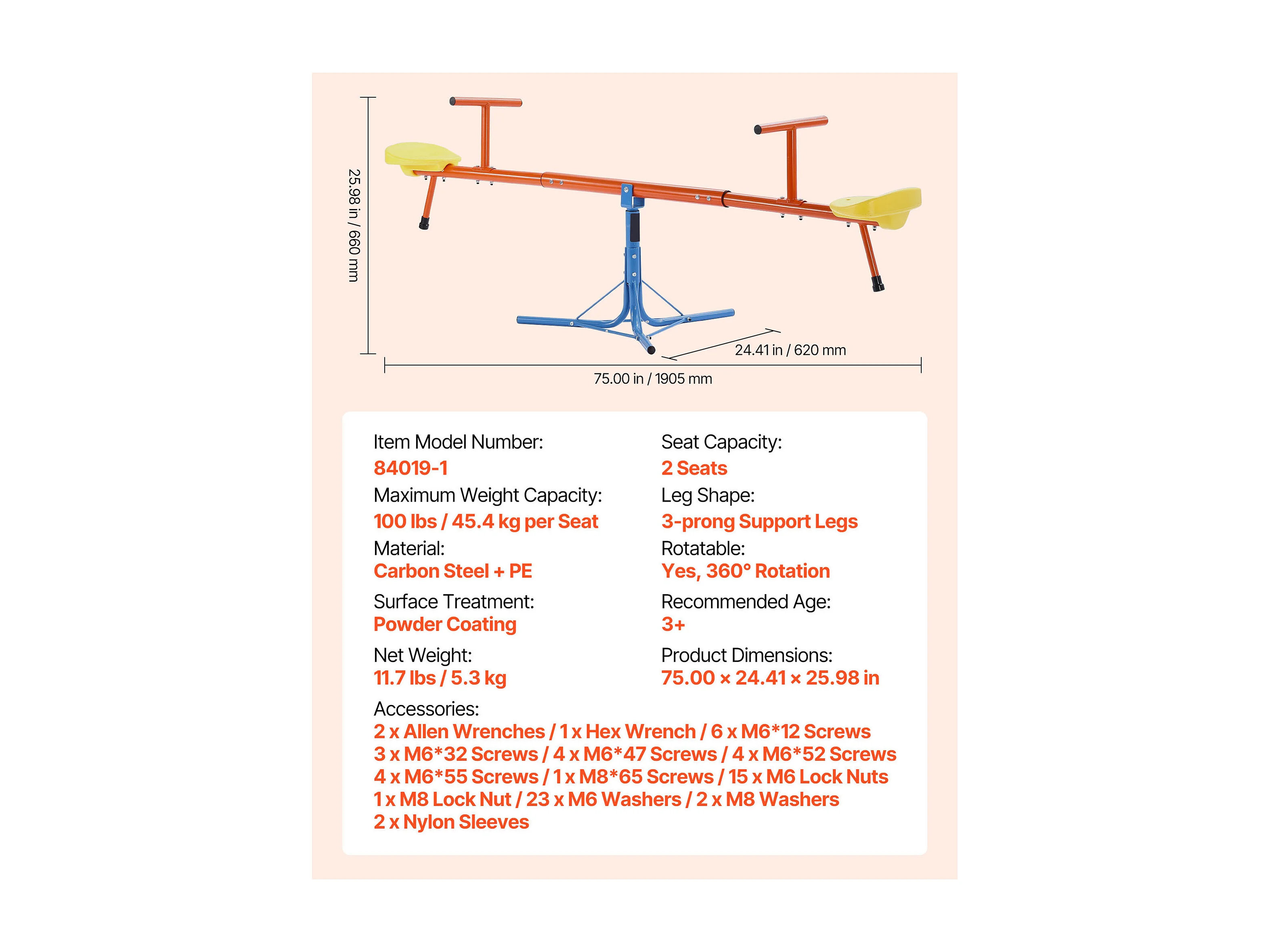 Columpio de Balancín SucceBuy para Niños, Capacidad 45,4 kg por Asiento, con Asas Ergonométricas, Patas de Soporte de 3 Ramas, Rotación 360°