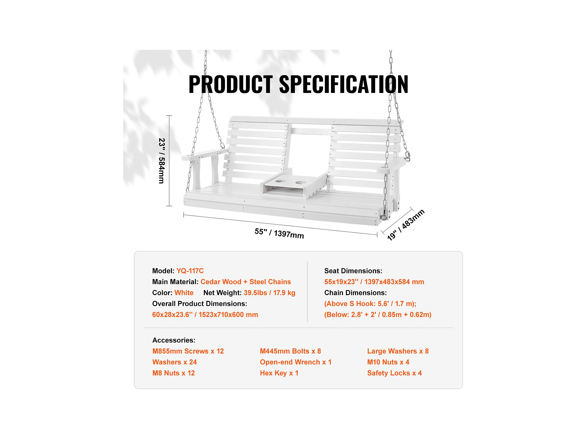 Columpio de Porche SucceBuy, de Madera de 152,4 cm,Silla Suspendida para Jardín, Patio o Terraza, Blanco