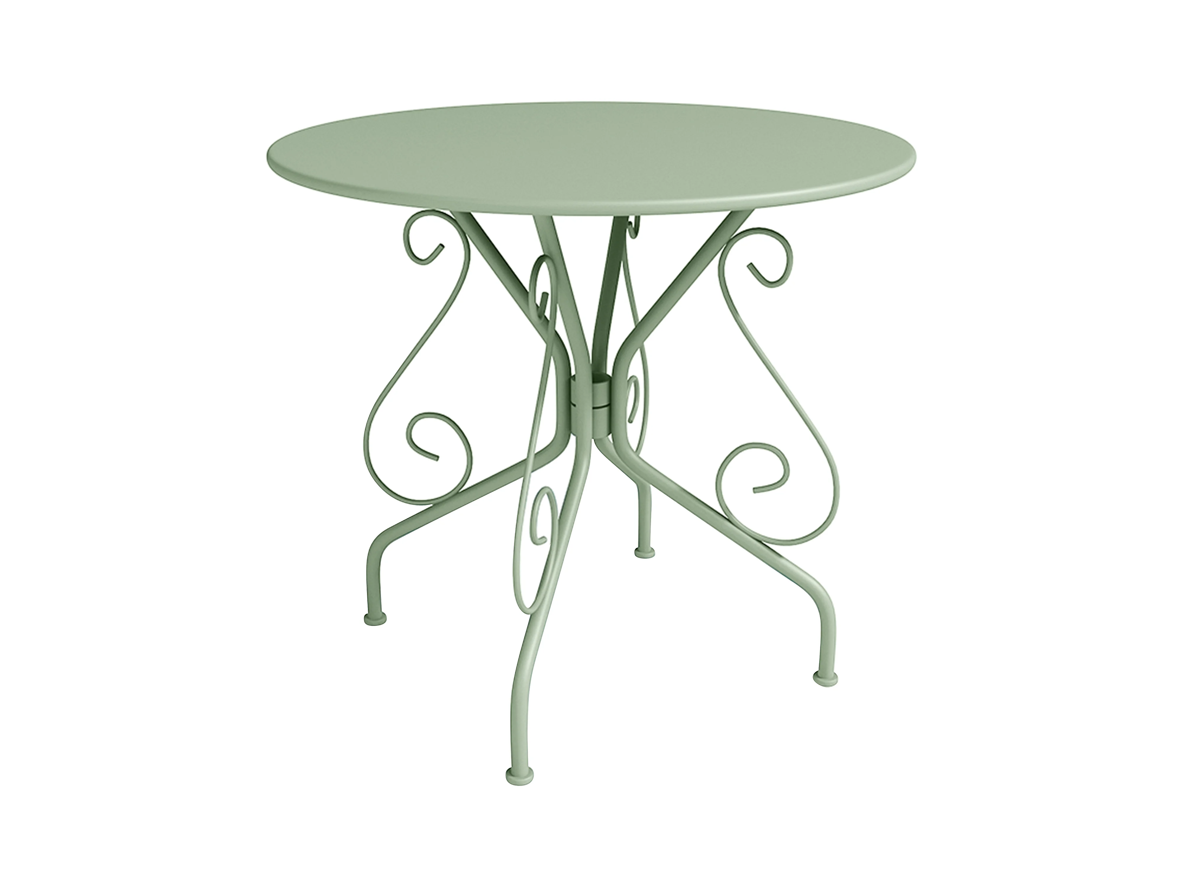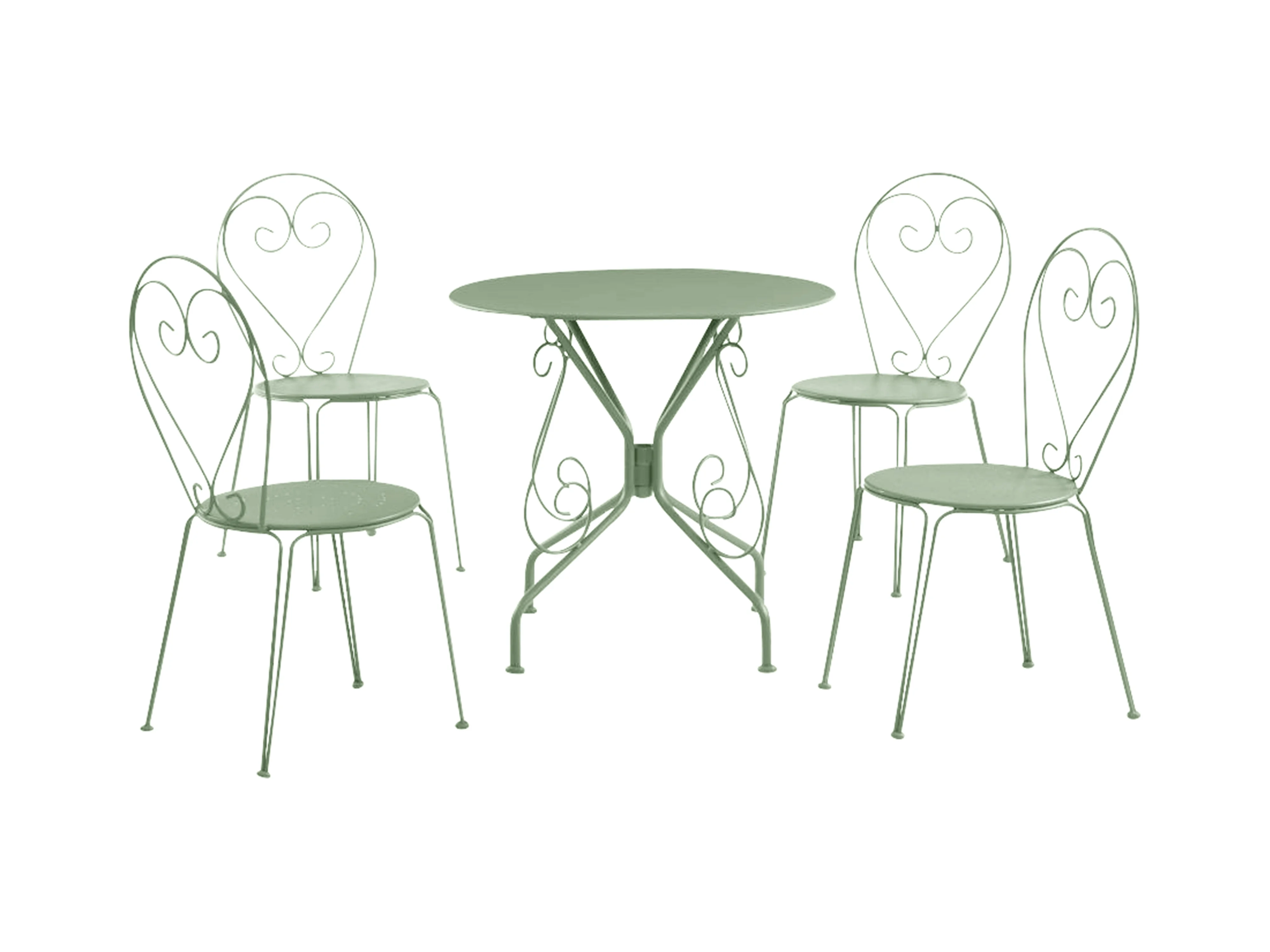 Comedor de jardín de metal tipo hierro forjado: una mesa y 4 sillas apilables - verde almendra - GUERMANTES