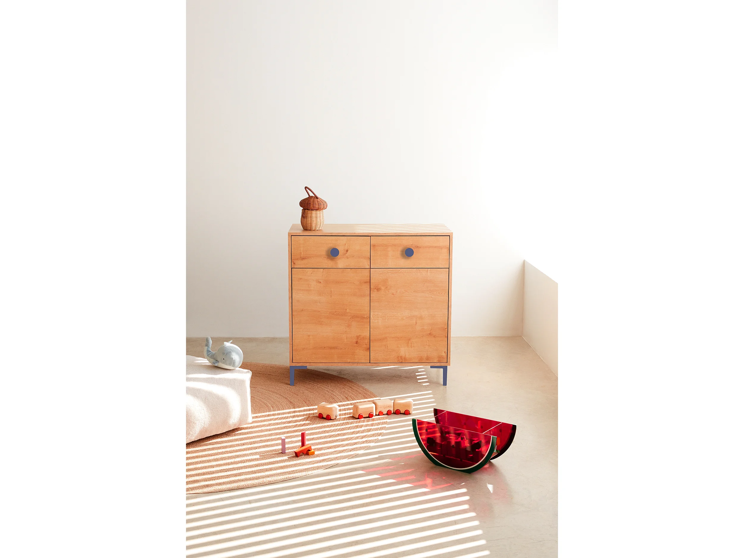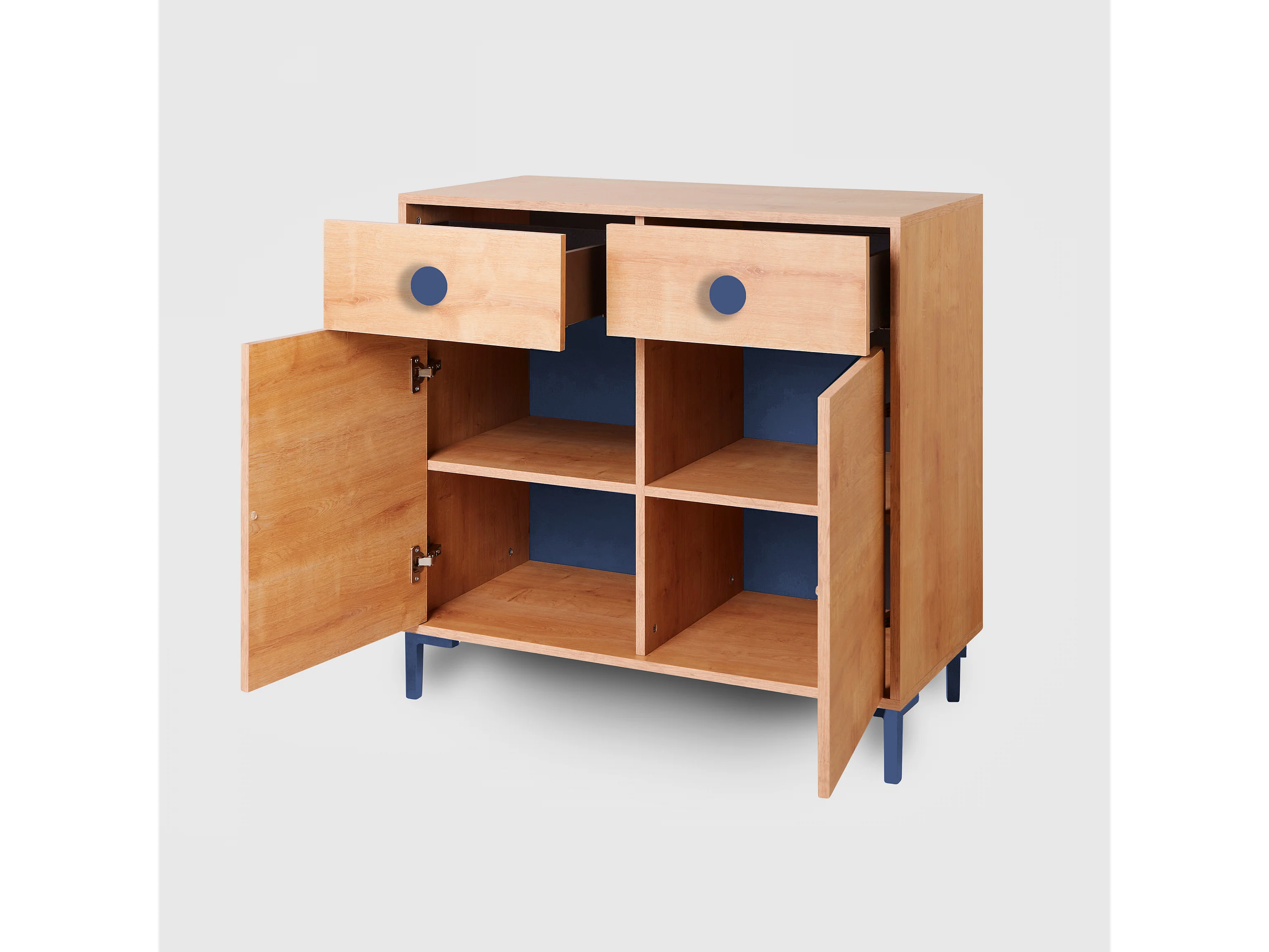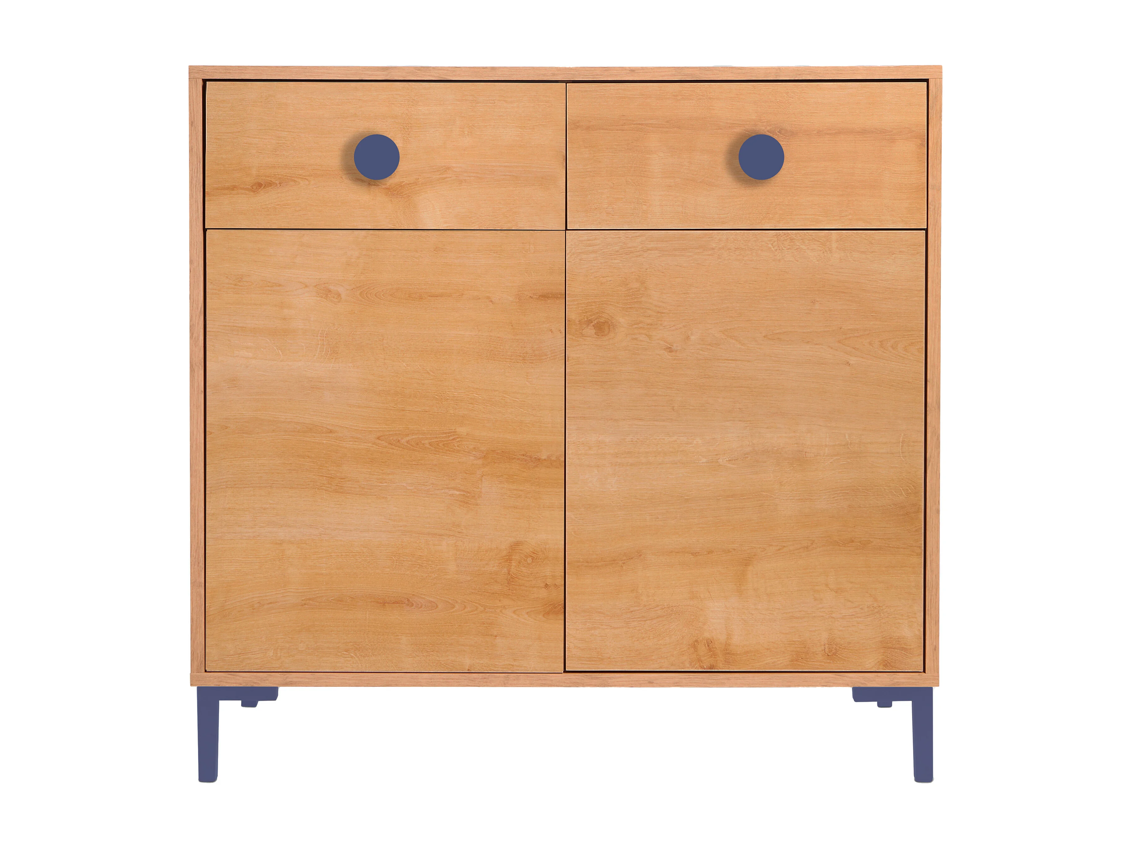 Cómoda 2 puertas 2 cajones color roble y detalles en azúl
