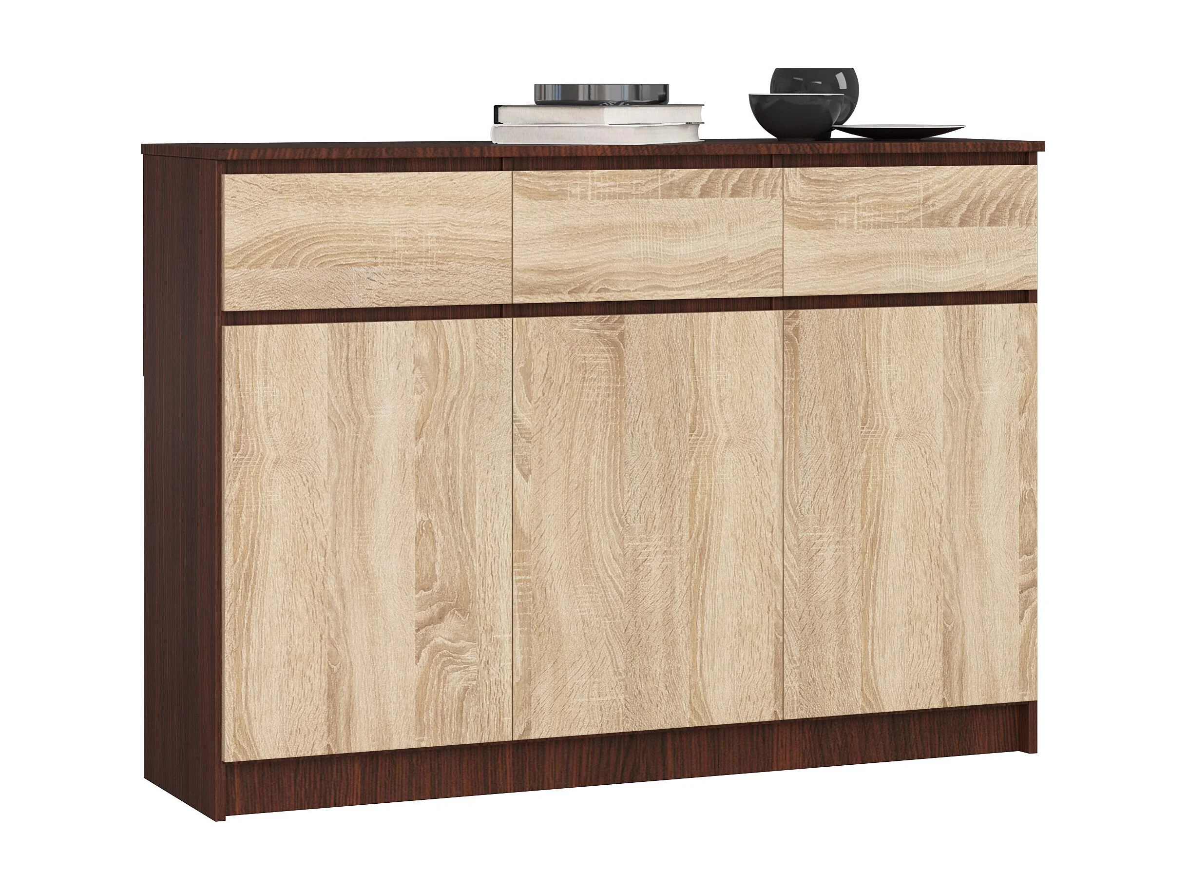 Cómoda AKORD K140 Wenge 138 cm 3 puertas 3 cajones frente en color Roble Sonoma 6 estantes 138x40x99 cm