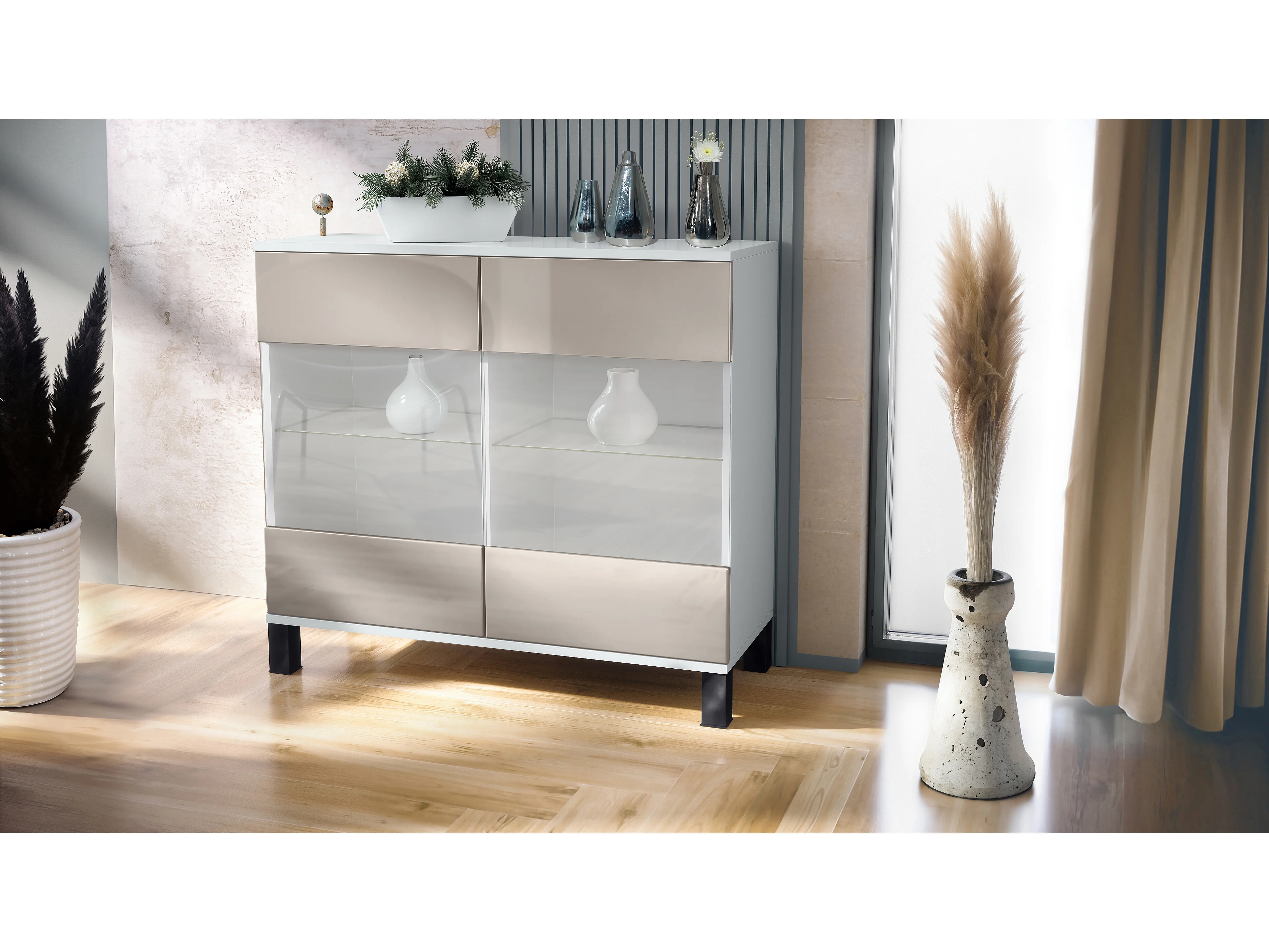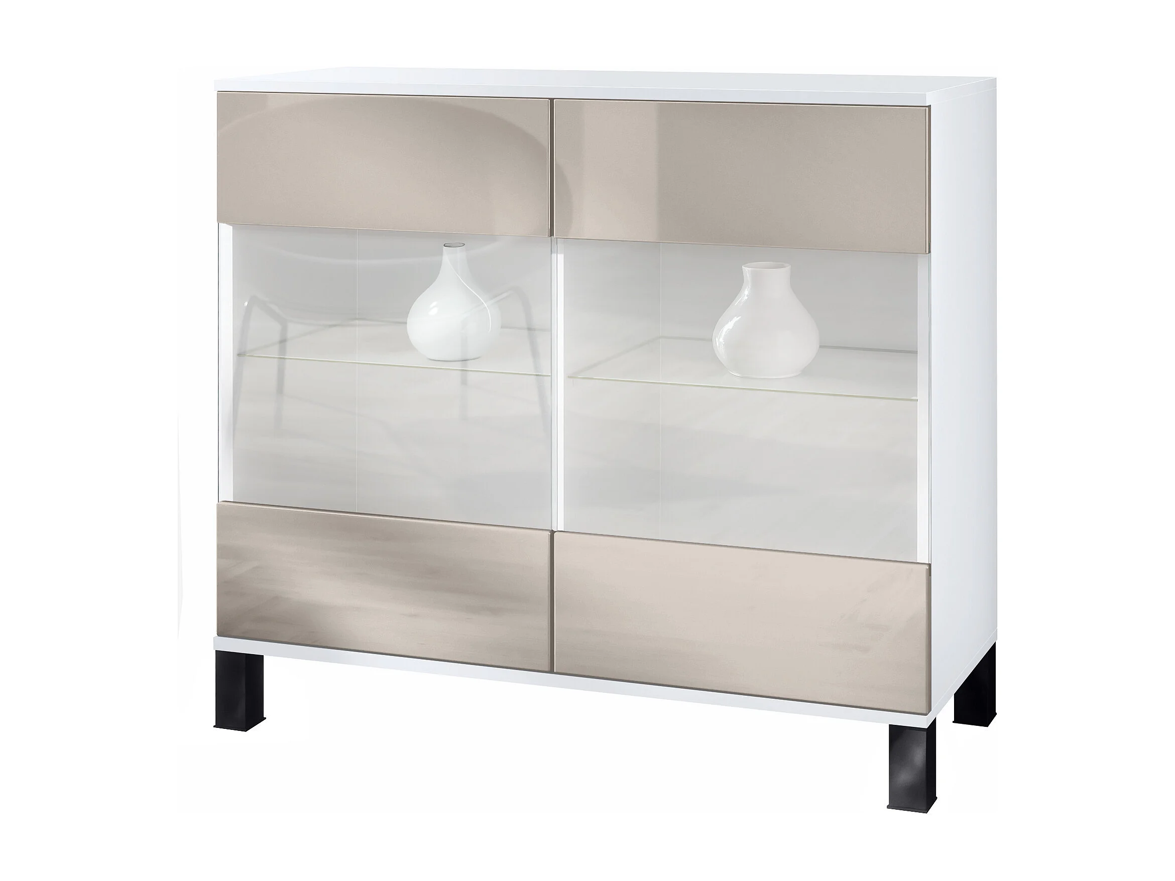 Cómoda Grömitz V3, Moderno armario de cocina con 2 grandes puertas de cristal incl. iluminación RGB blanco mate / crema de alto brillo (92,5 x 84.5 x 35)