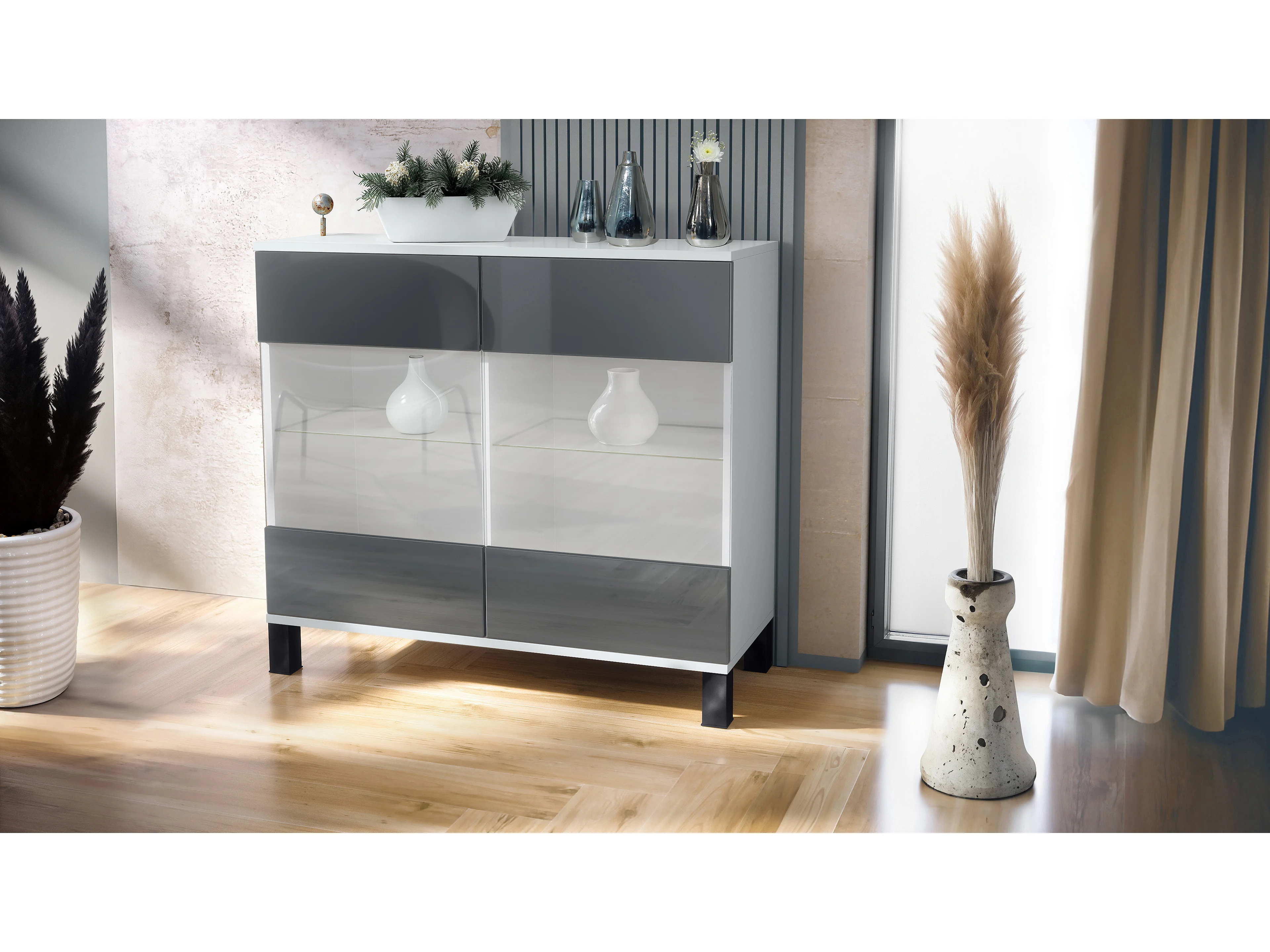 Cómoda Grömitz V3, Moderno armario de cocina con 2 grandes puertas de cristal incl. iluminación RGB blanco mate / gris de alto brillo (92,5 x 84.5 x 35)