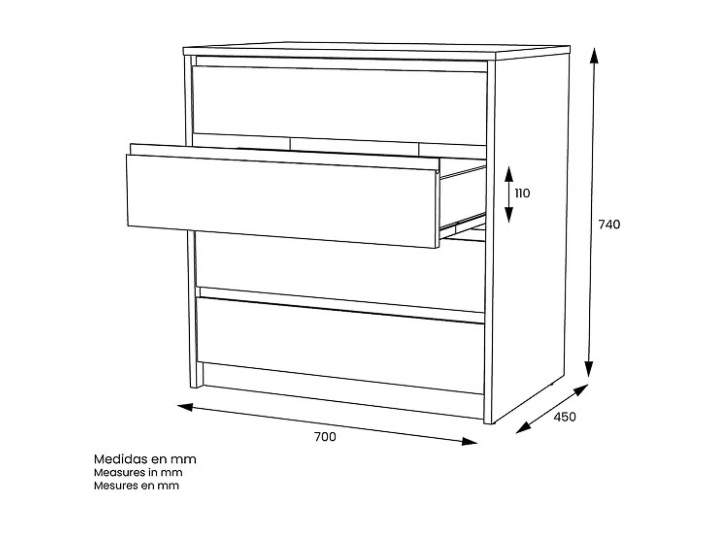 Cómoda Cajonera 4 cajones acabado en Color Roble 74cm(alto) 60cm(ancho) 45cm(fondo)