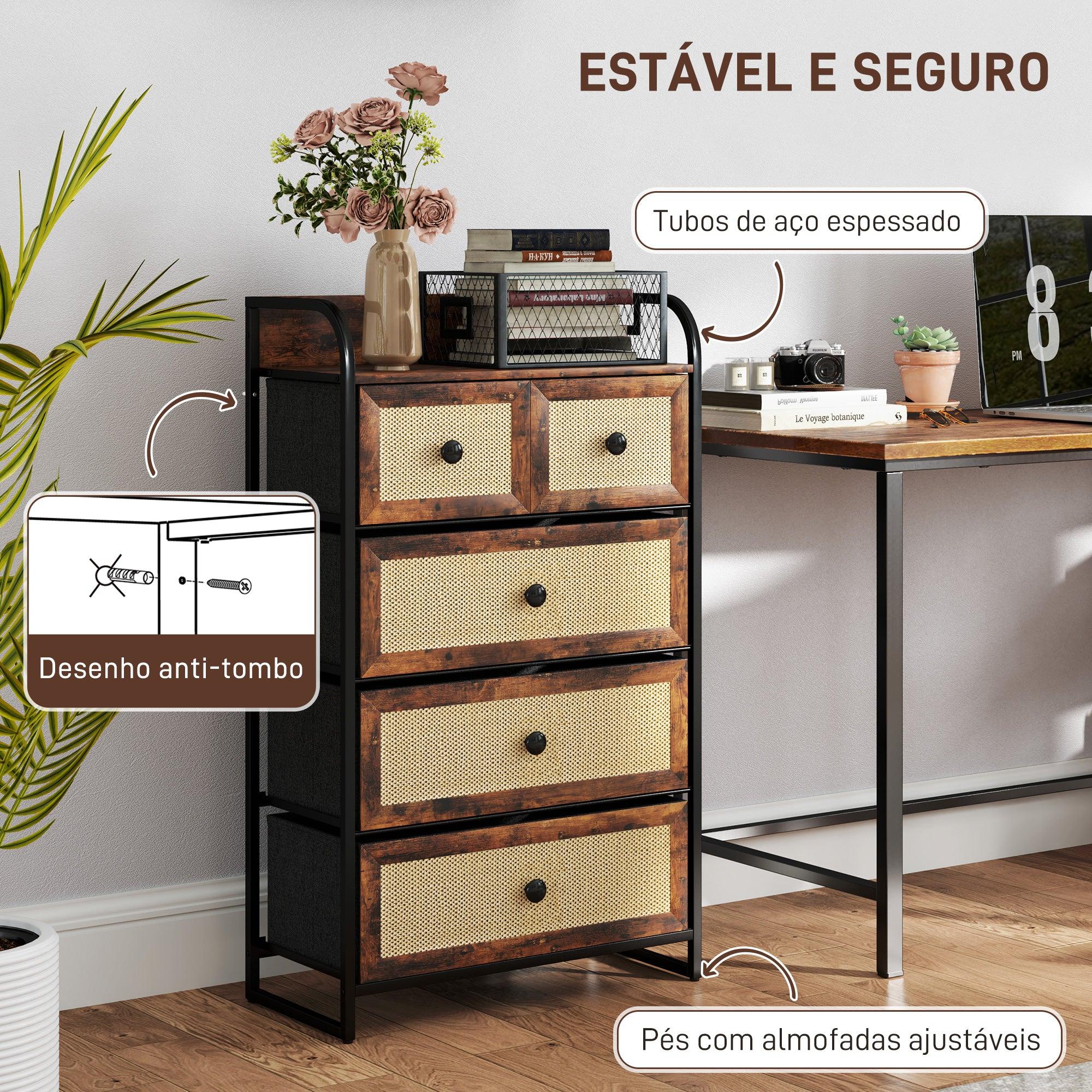La cómoda Cleo de Homcom es la solución perfecta para quienes buscan un mueble práctico con un toque bohemio y elegante. Su estructura de acero reforzado aporta estabilidad, mientras que sus cinco cajones de tela con frentes de ratán sintético ofrecen un diseño cálido y natural que se adapta a cualquier ambiente. Gracias a su amplia capacidad de almacenamiento, esta cómoda es ideal para mantener ordenadas prendas de vestir, accesorios y otros objetos del hogar. Sus cajones extraíbles y plegables facilitan la organización, y su encimera laminada proporciona un espacio adicional para colocar decoraciones, libros o marcos de fotos.