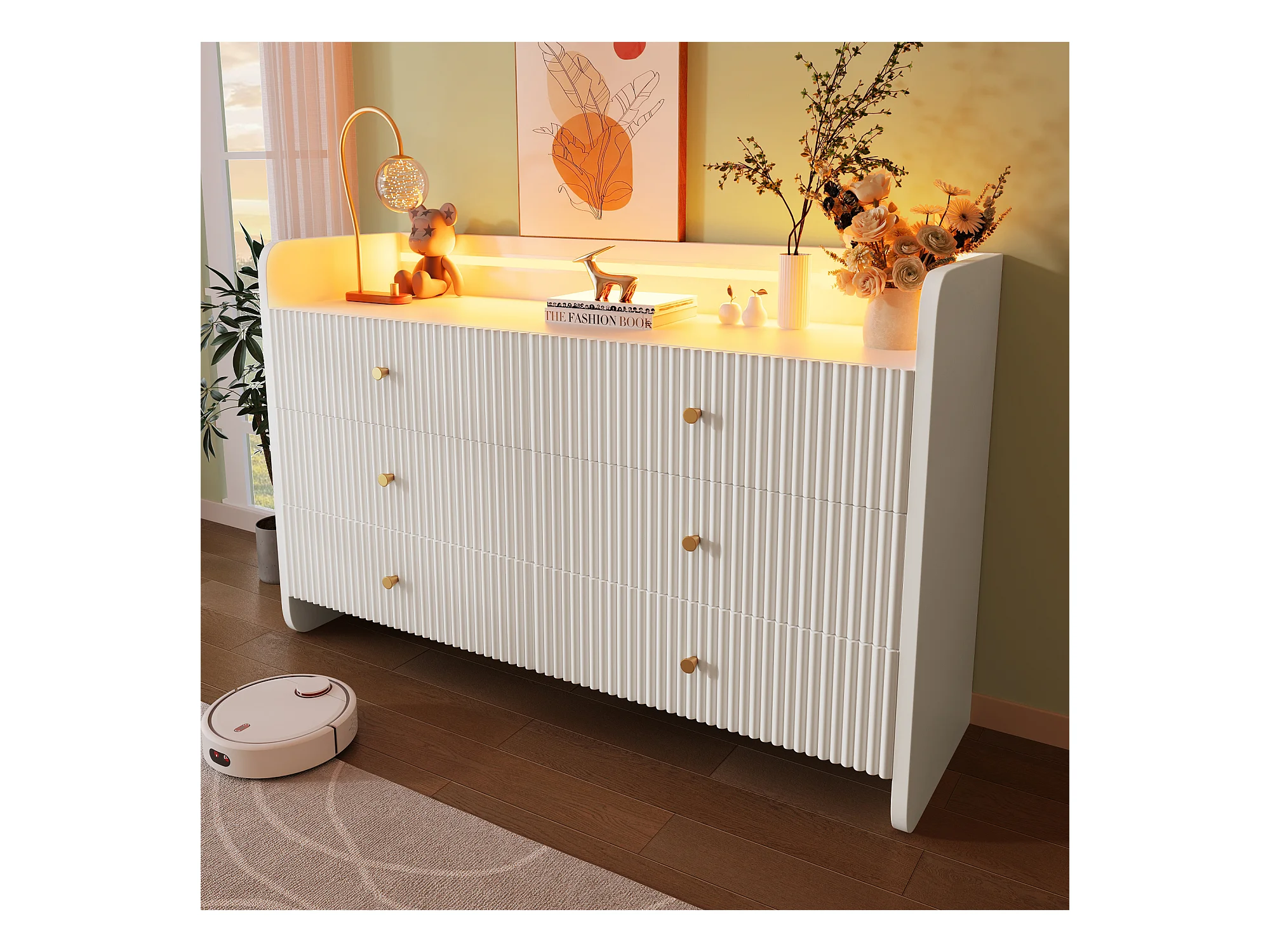 Cómoda con LED, 6 cajones, diseño ondulado, MDF, blanco (120x40x75 cm)