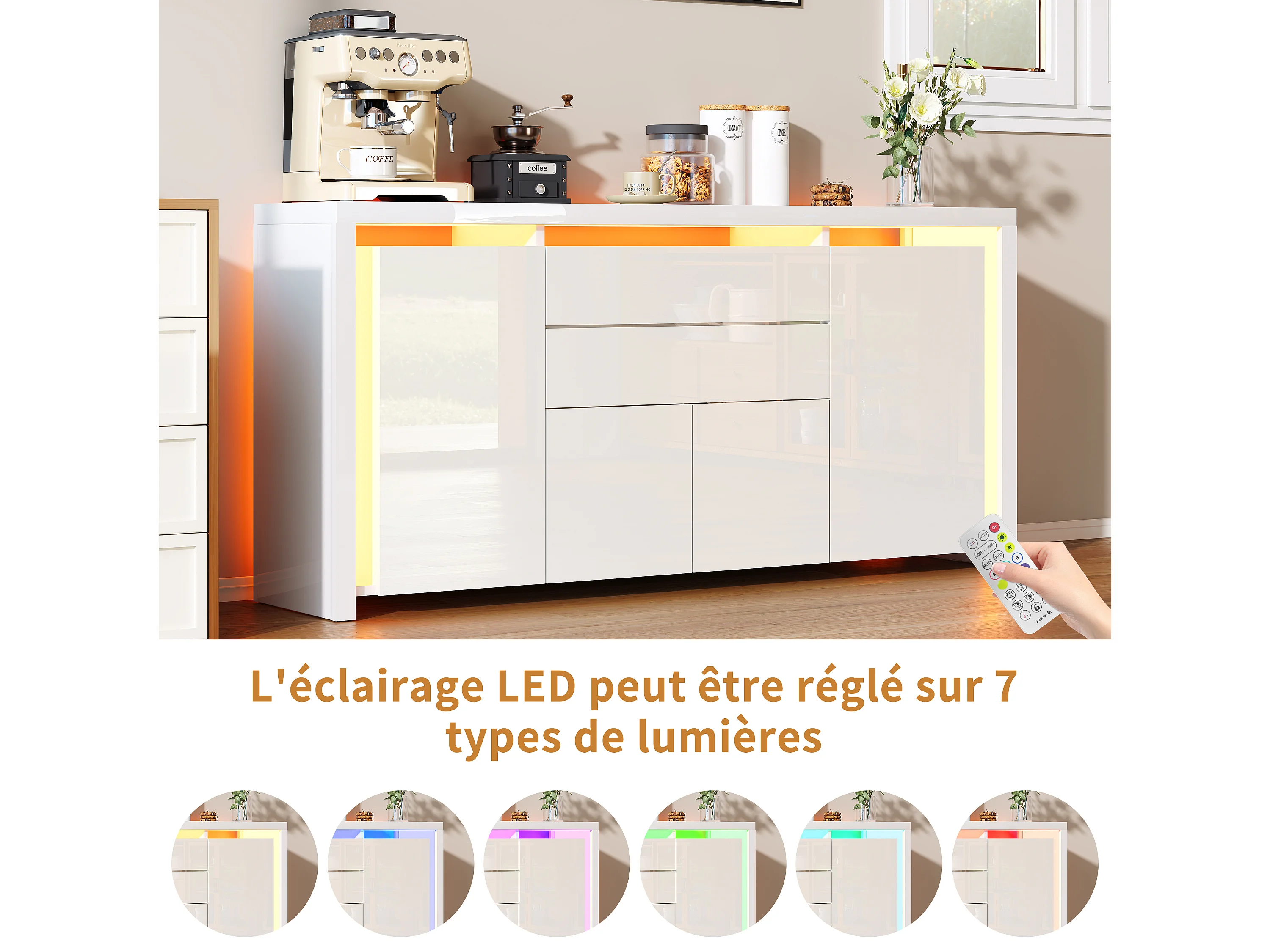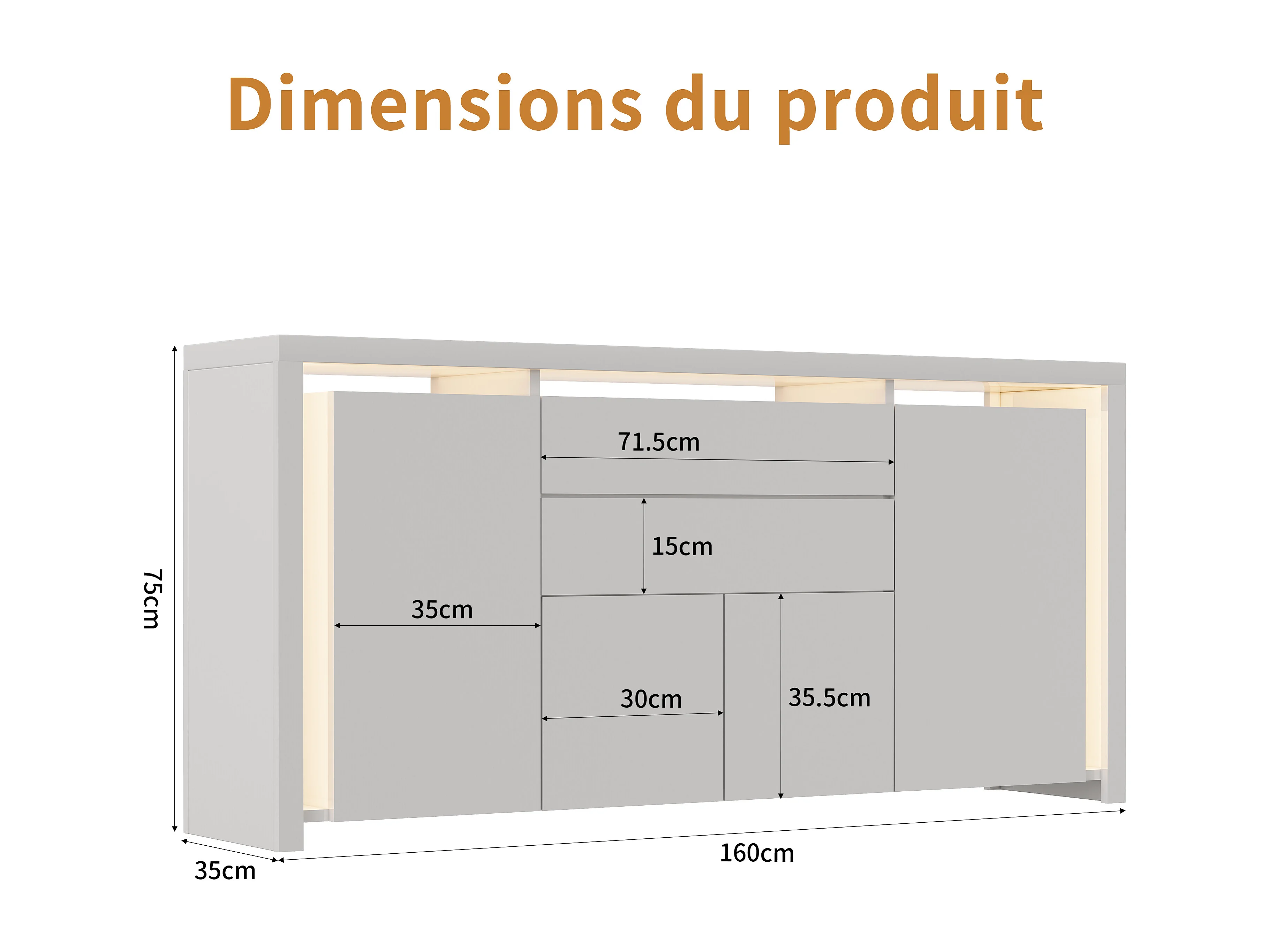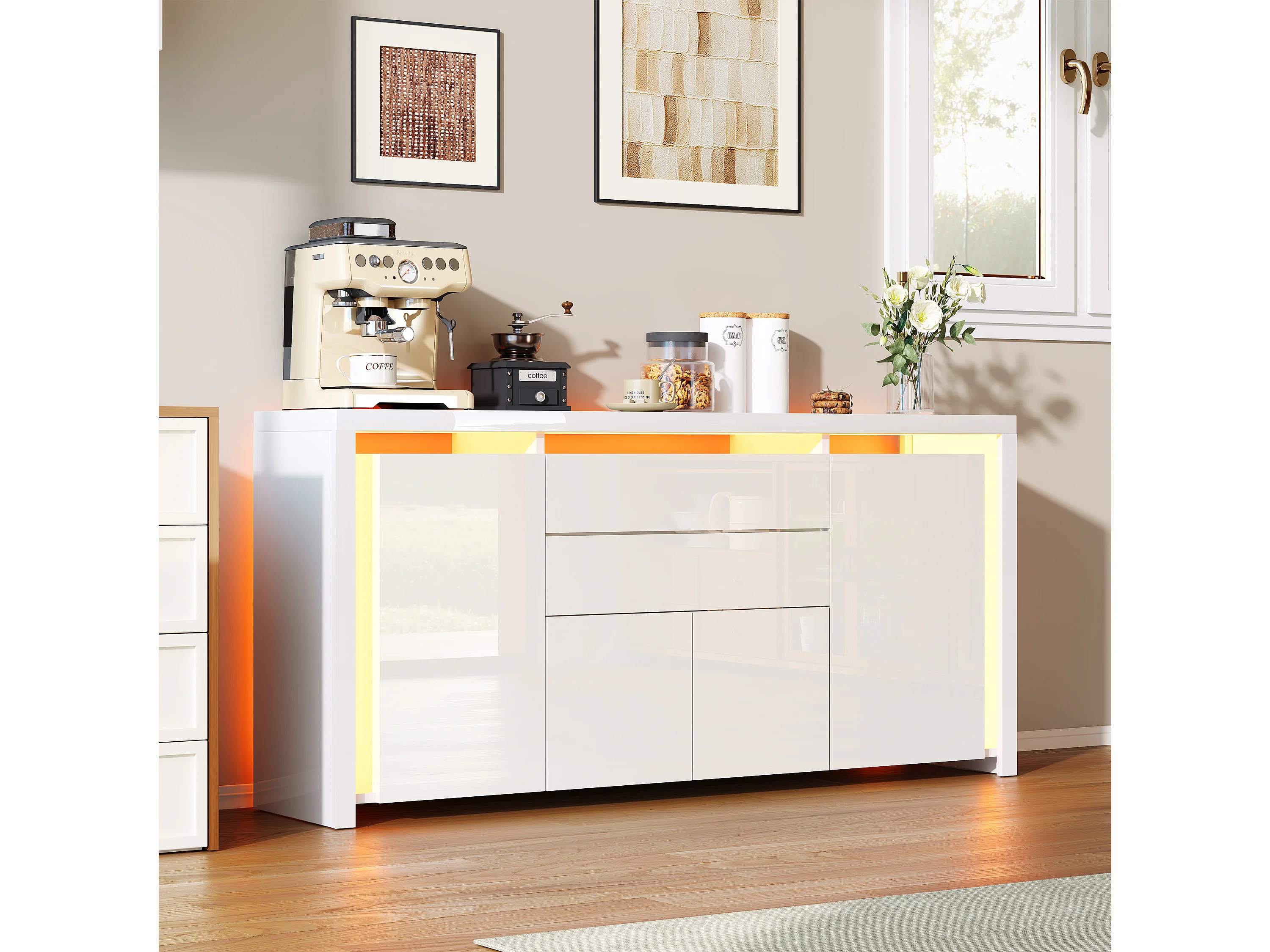 Cómoda de 160 x 35 x 75 cm con 2 cajones, 4 puertas, iluminación LED, aparador con espacio de almacenaje, blanca.