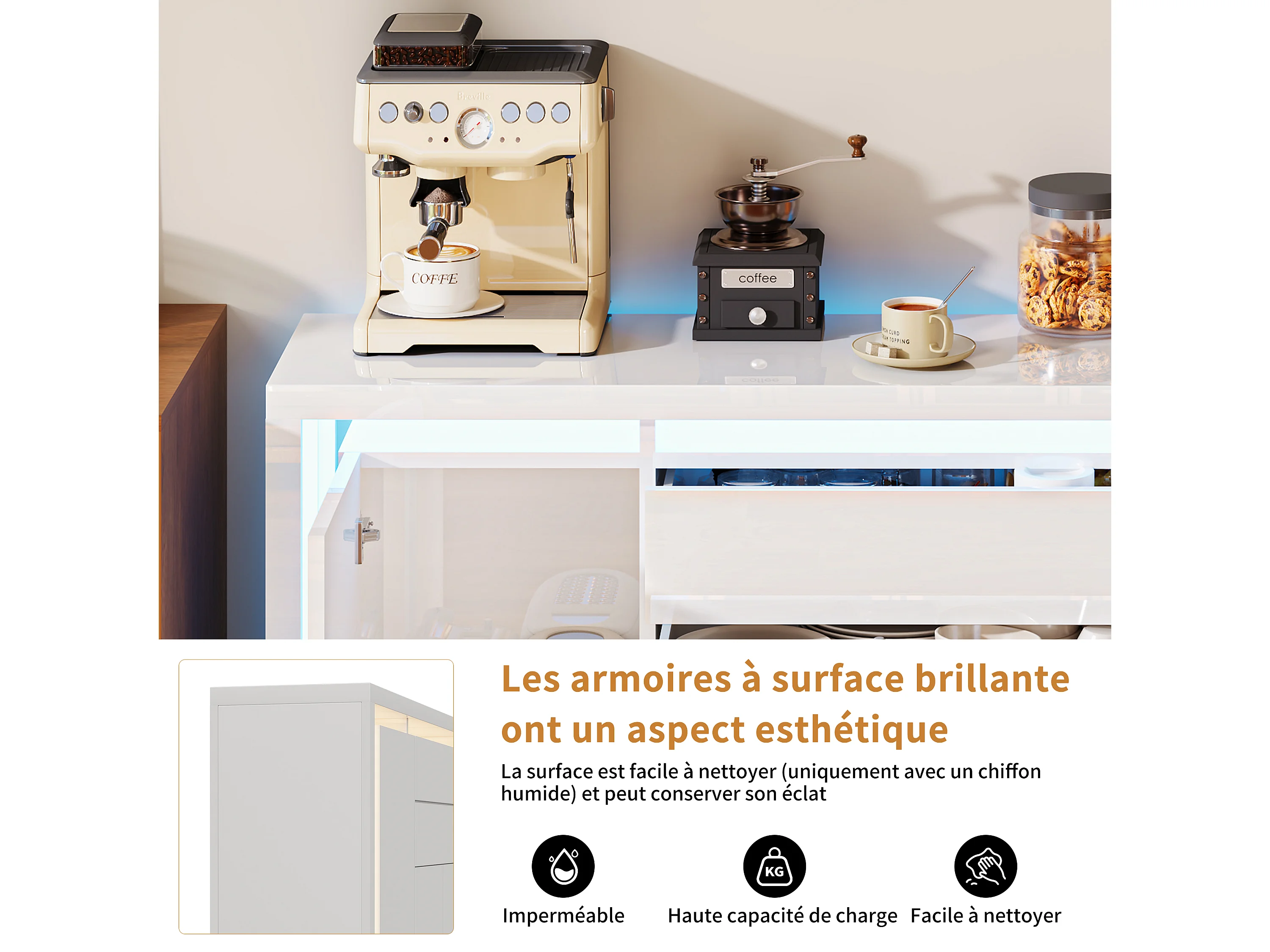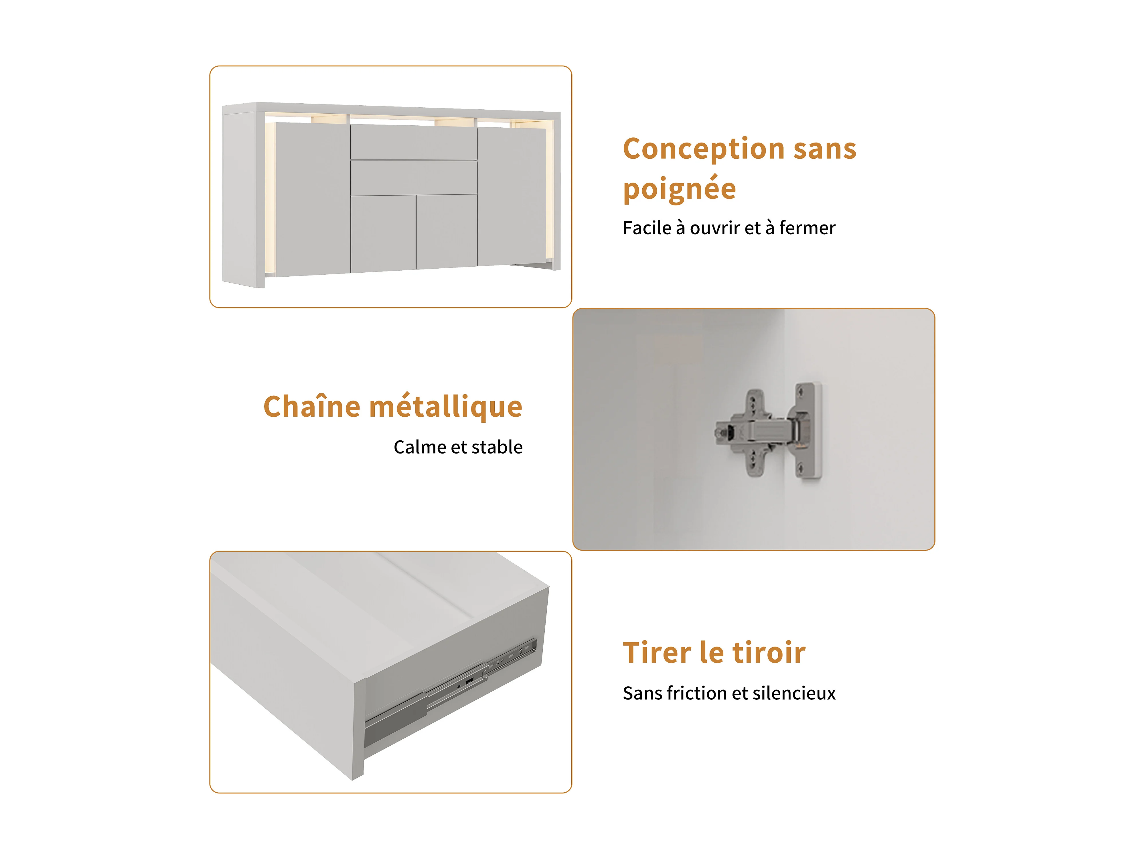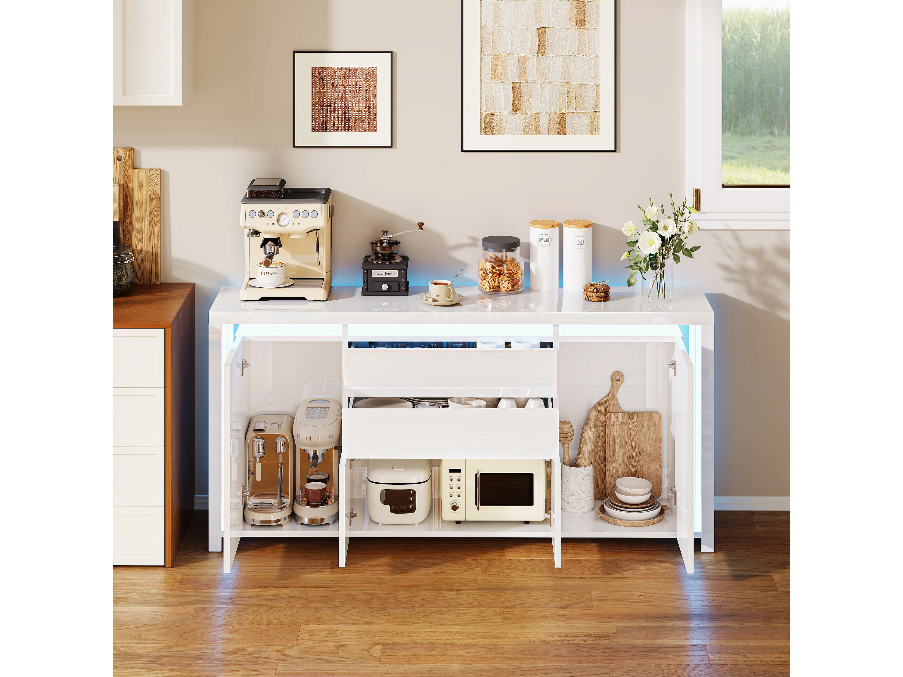 Cómoda de 160 x 35 x 75 cm con 2 cajones, 4 puertas, iluminación LED, aparador con espacio de almacenaje, blanca.
